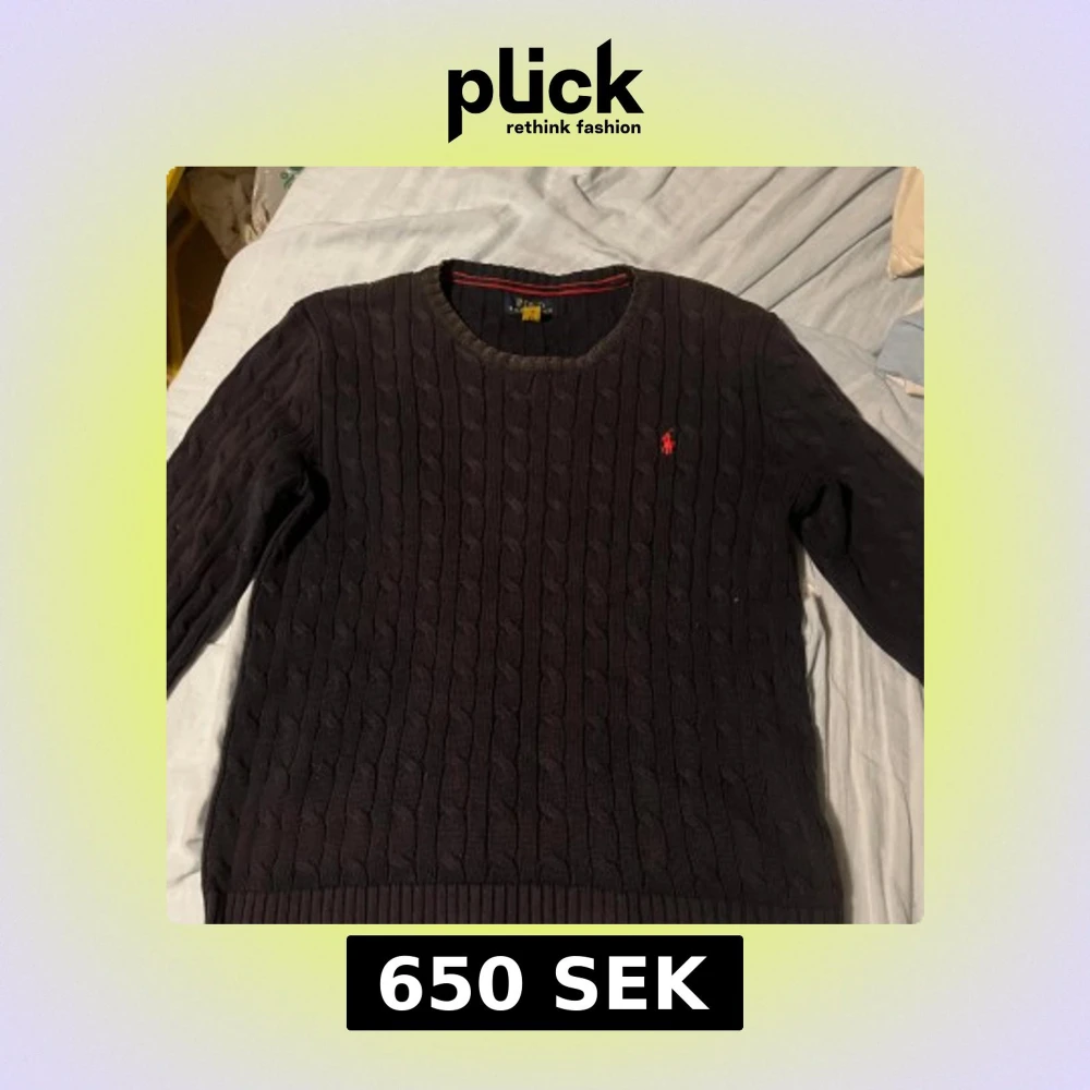 Säljer en mörkblå stickad tröja från Polo Ralph Lauren med klassiskt kabelstickat mönster och röd broderad logga på bröstet. Tröjan har rund hals och långa ärmar, perfekt för dig som gillar stilren och tidlös design. Skriv prisförslag för snabb förhandling