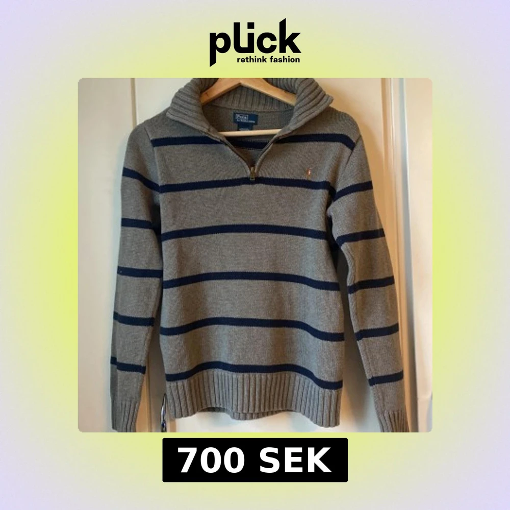 Snygg stickad äkta tröja från Polo Ralph Lauren i grått med marinblå ränder. Tröjan har krage, half zip-dragkedja och klassisk broderad logga på bröstet. långa ärmar med ribbade muddar.