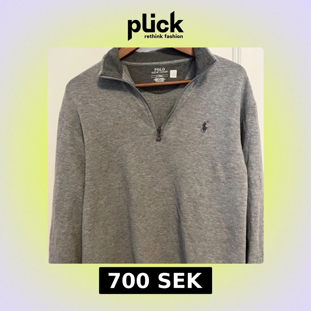 Säljer en stilren grå tröja från Polo Ralph Lauren med dragkedja vid halsen. Tröjan har en broderad logotyp på bröstet och är perfekt för en avslappnad look. Är knappt använd och är som helt ny