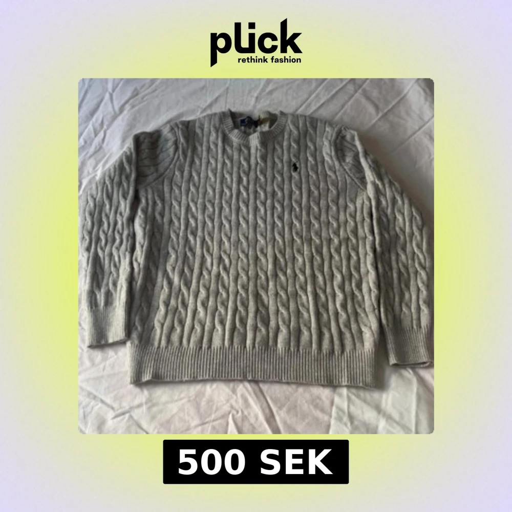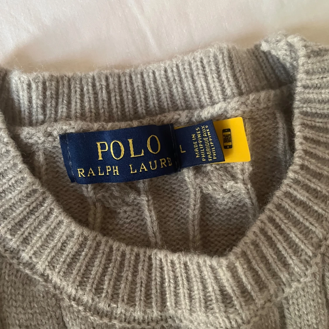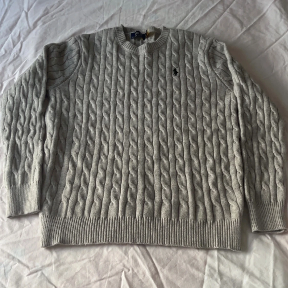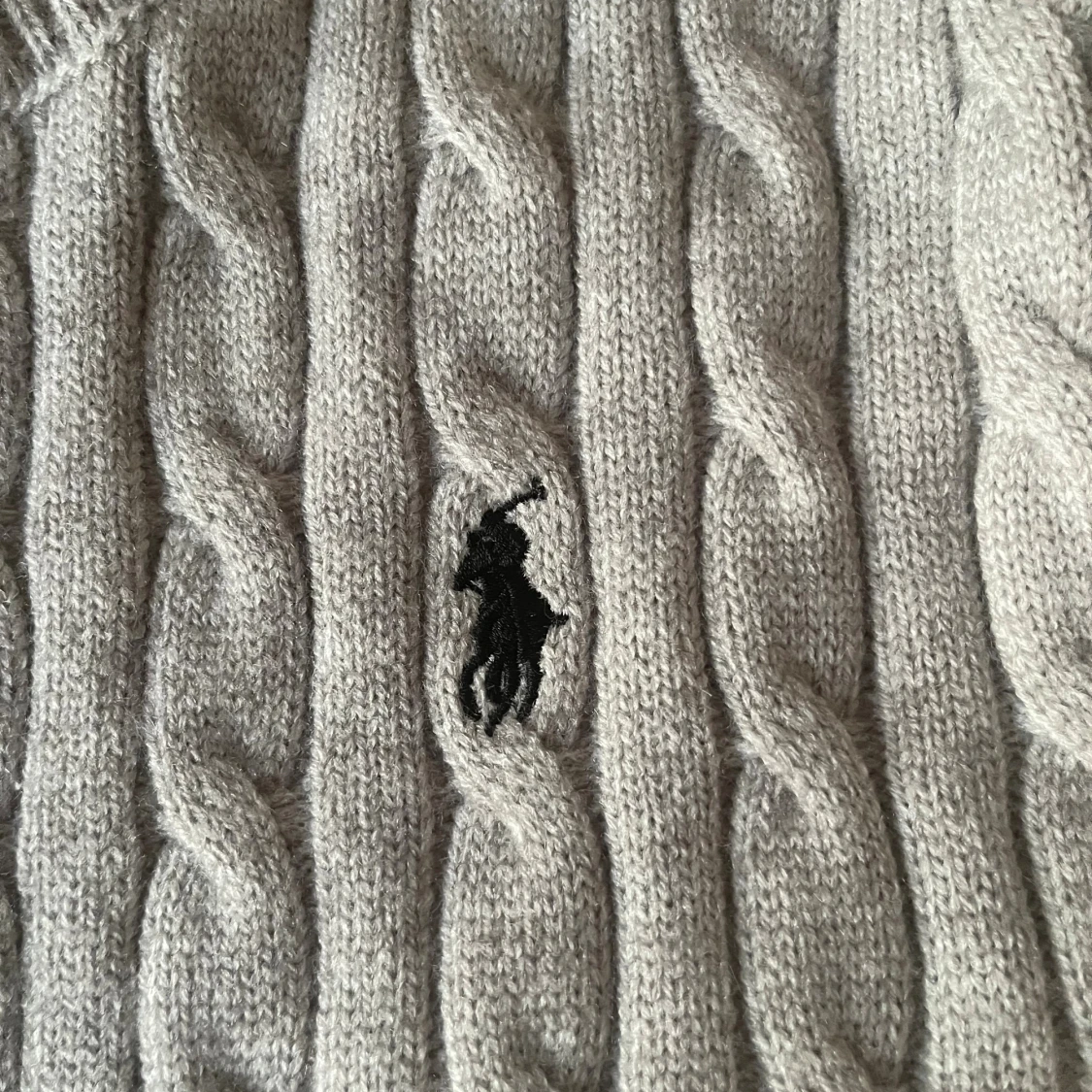 Kabelstickad grå tröja från Polo Ralph Lauren med klassisk rund halsringning och broderad svart logga på bröstet. Tröjan är i mjuk ullblandning och har ribbade muddar vid ärmslut och nederkant. Perfekt för lager-på-lager under kyliga dagar. klädlängd 68 och axellängd 42