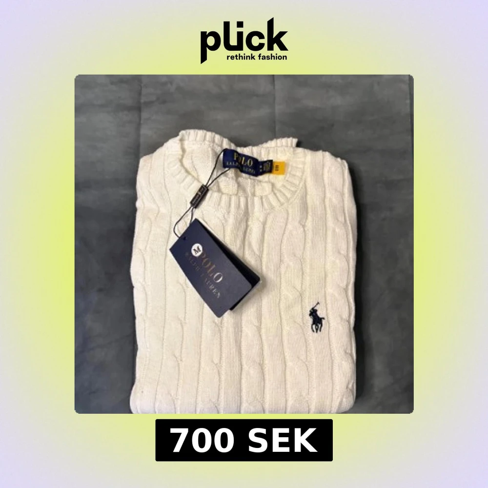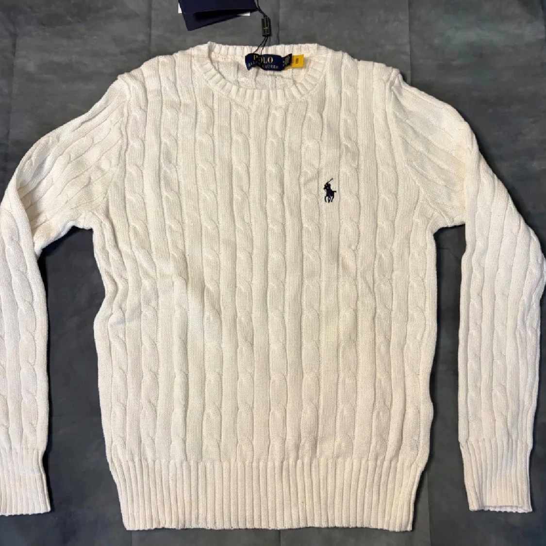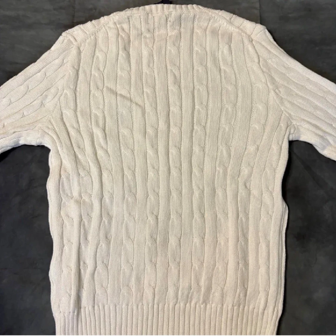 Snygg vit kabelstickad tröja från Polo Ralph Lauren med klassisk rund hals och broderad marinblå logga på bröstet. Tröjan har ribbade muddar och är långärmad, perfekt för dig som gillar stilren och tidlös design.