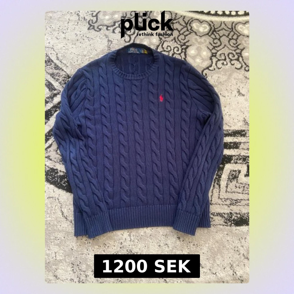 Säljer en marinblå stickad tröja från Polo Ralph Lauren i storlek M. Tröjan har ett klassiskt kabelstickat mönster, rund hals och en röd broderad logga på bröstet. Perfekt för dig som gillar stilrena och tidlösa plagg.
