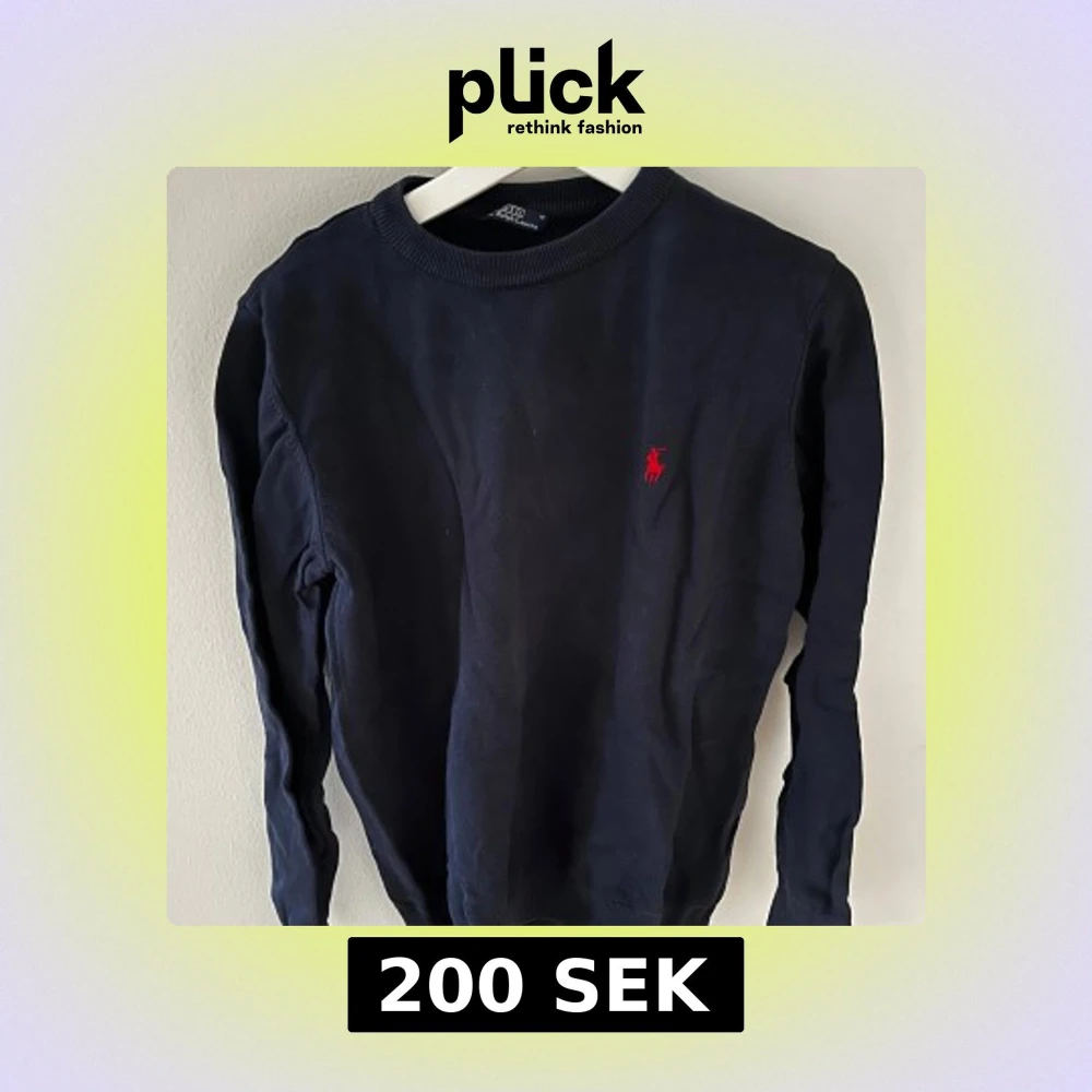 Säljer en stilren mörkblå tröja från Ralph Lauren med det klassiska röda logotypbroderiet på bröstet. Tröjan har långa ärmar och en rund halsringning. Perfekt för en avslappnad men ändå snygg look.