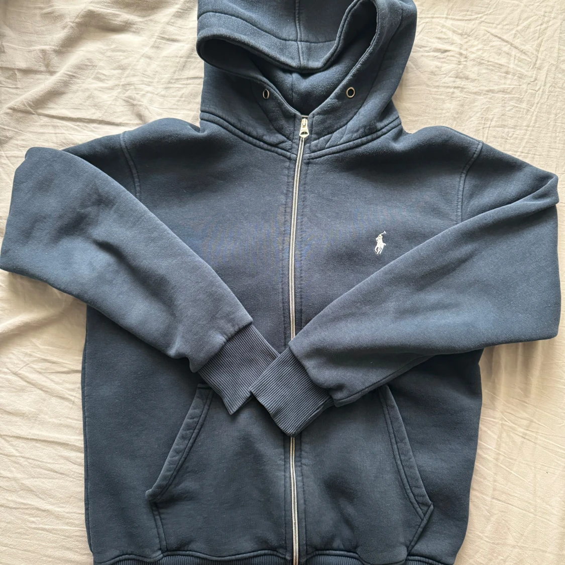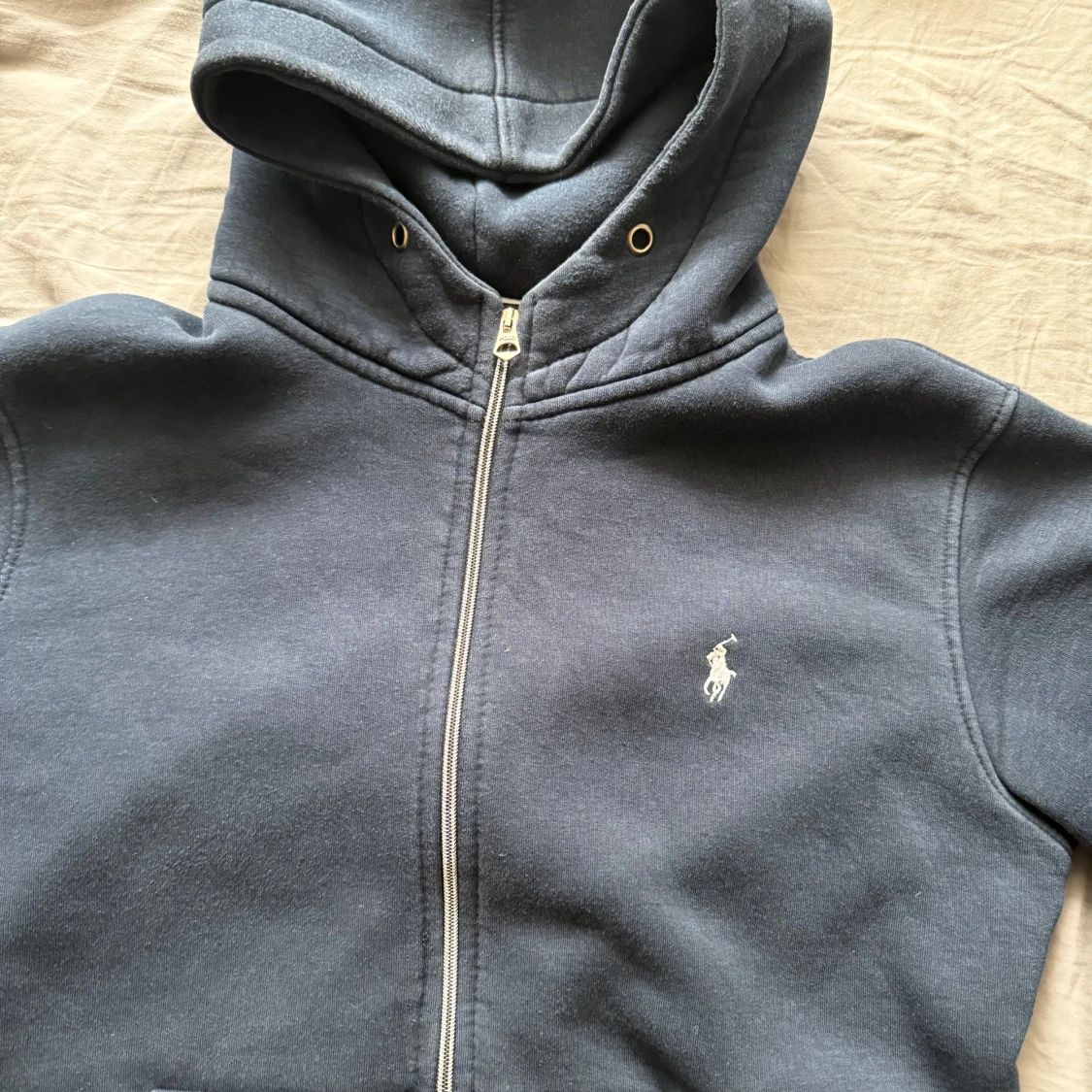 Mörkblå hoodie med dragkedja från Polo Ralph Lauren. Klassisk design med vit broderad logga på bröstet, huva med snörhål och två fickor framtill. Mjuk insida och ribbade muddar vid ärmslut och nederkant.