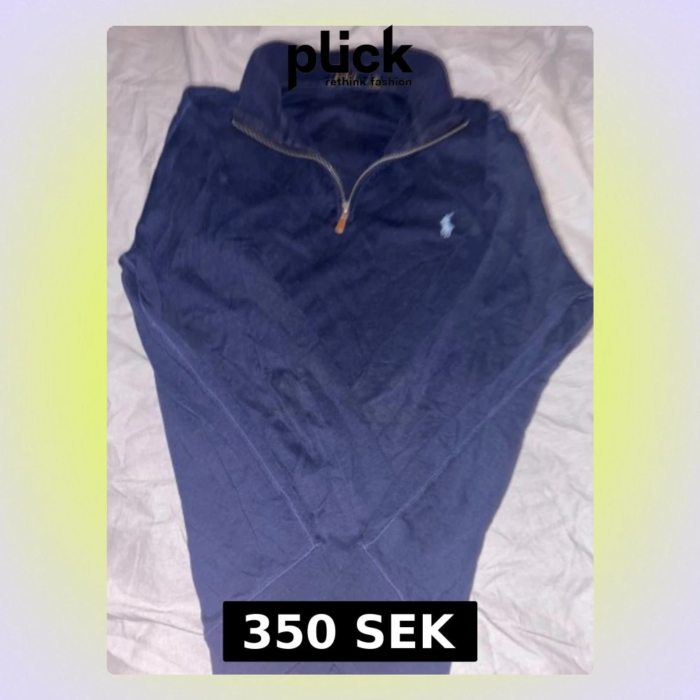 Snygg marinblå tröja från Polo Ralph Lauren i storlek M. Tröjan har en klassisk half zip-dragkedja och den ikoniska broderade loggan på bröstet. Tillverkad i mjuk bomull med ribbade muddar och krage. Perfekt för chill dagar och enkel att matcha med jeans.