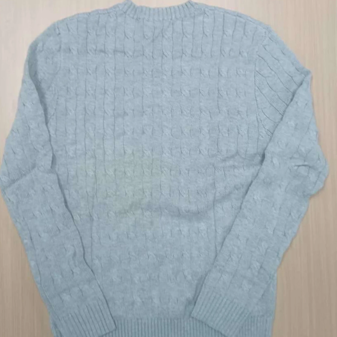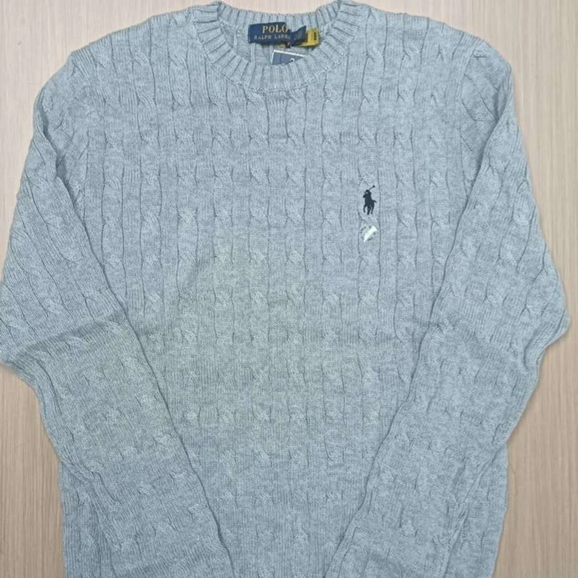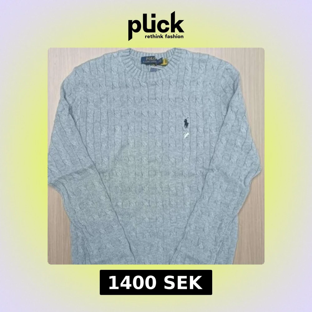 Säljer en grå stickad tröja från Polo Ralph Lauren med klassiskt kabelstickat mönster och rund hals. Tröjan har långärmade ribbade muddar och den ikoniska Polo-loggan broderad på bröstet. Perfekt för dig som gillar stilren och tidlös design. Icke använd, Säljer för det inte är min still längre