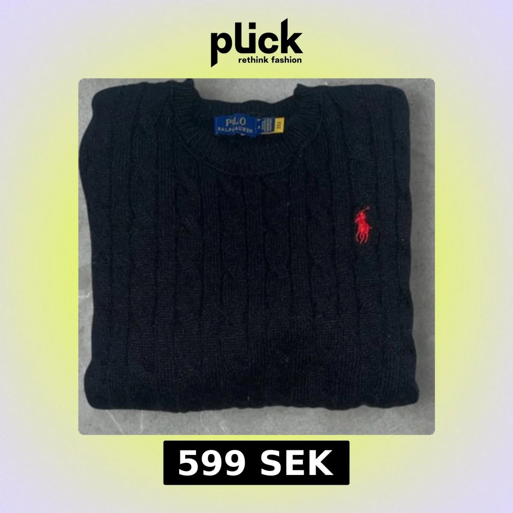 Svart kabelstickad tröja från Polo Ralph Lauren i storlek M. Klassisk rund hals och långärmad modell med röd broderad logga på bröstet. Tröjan är gjord i mjuk bomull och har ribbade muddar vid ärmslut och nederkant. KVITTO FINNS