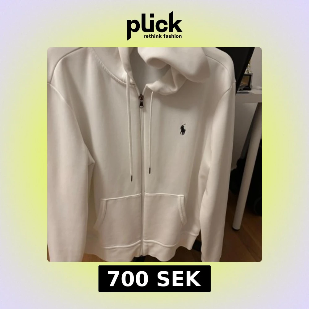 Säljer en stilren vit hoodie från Ralph Lauren med dragkedja och klassisk logga på bröstet. Tröjan har en justerbar huva med snören och praktiska fickor framtill. Perfekt för en avslappnad look. Storlek M passar även S