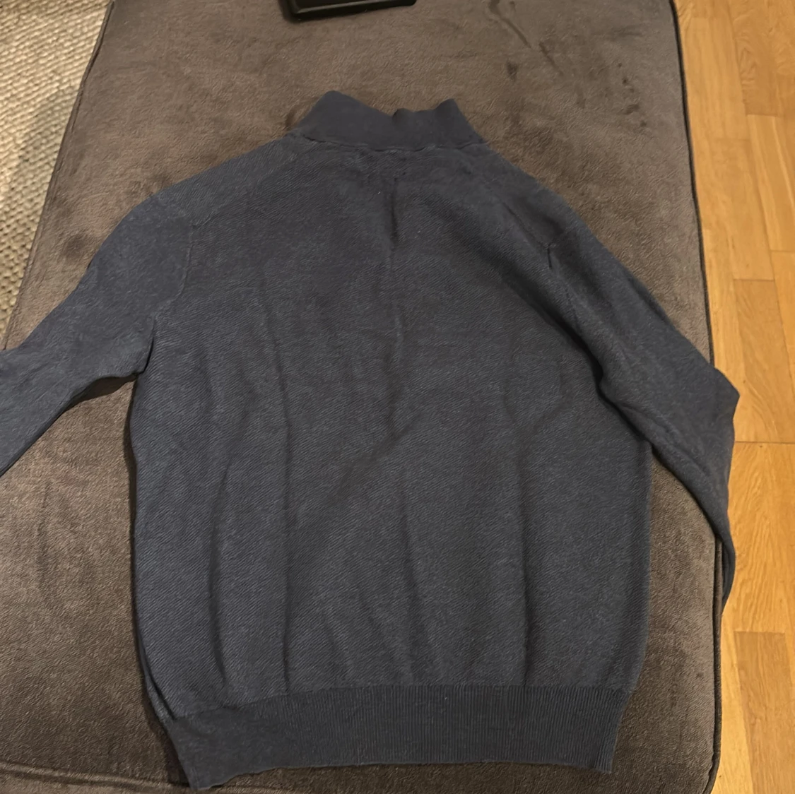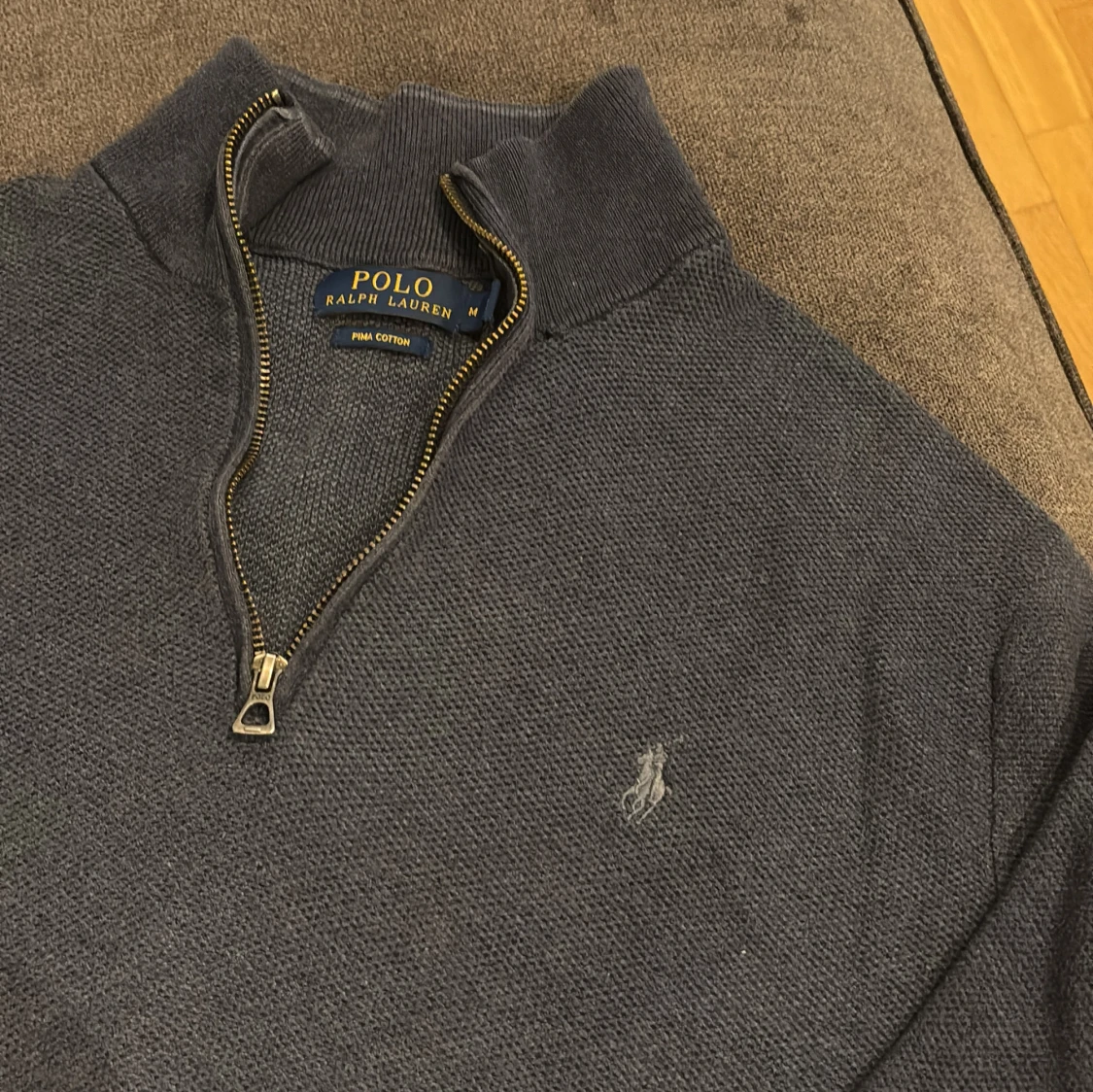 Säljer en stilren blå tröja från Polo Ralph Lauren med dragkedja och broderad logga på bröstet. Tröjan har långa ärmar och ribbade muddar vid ärmslut och nederkant. Perfekt för en avslappnad men snygg look.