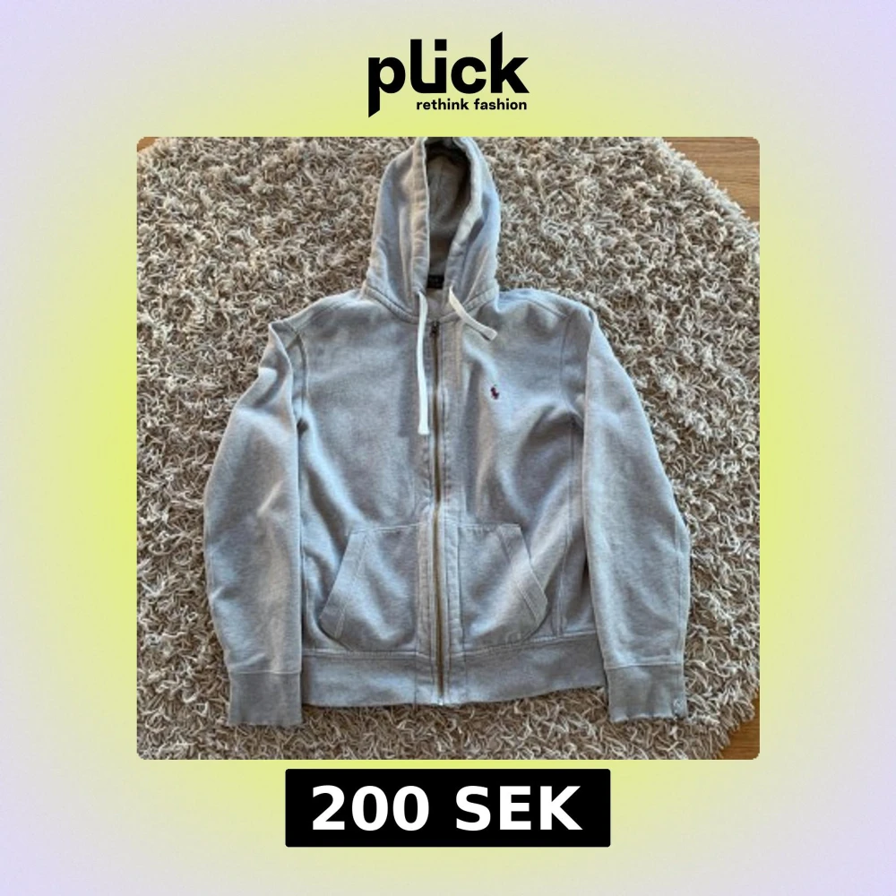 Klassisk grå hoodie från Polo Ralph Lauren i storlek M. Tröjan har dragkedja, huva med snörning och känguruficka framtill. Liten broderad logga på bröstet. Perfekt för chill dagar och enkel att matcha med jeans eller joggers. Titta bild 4&5.