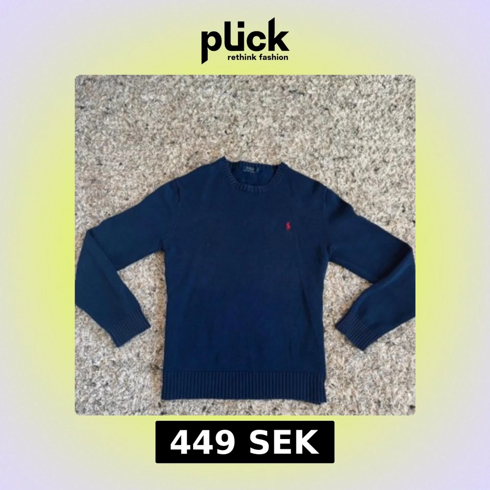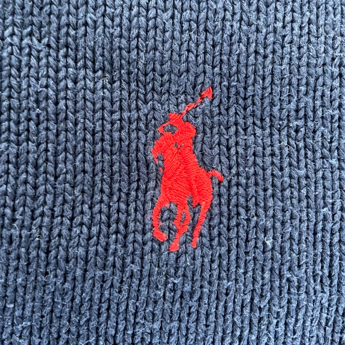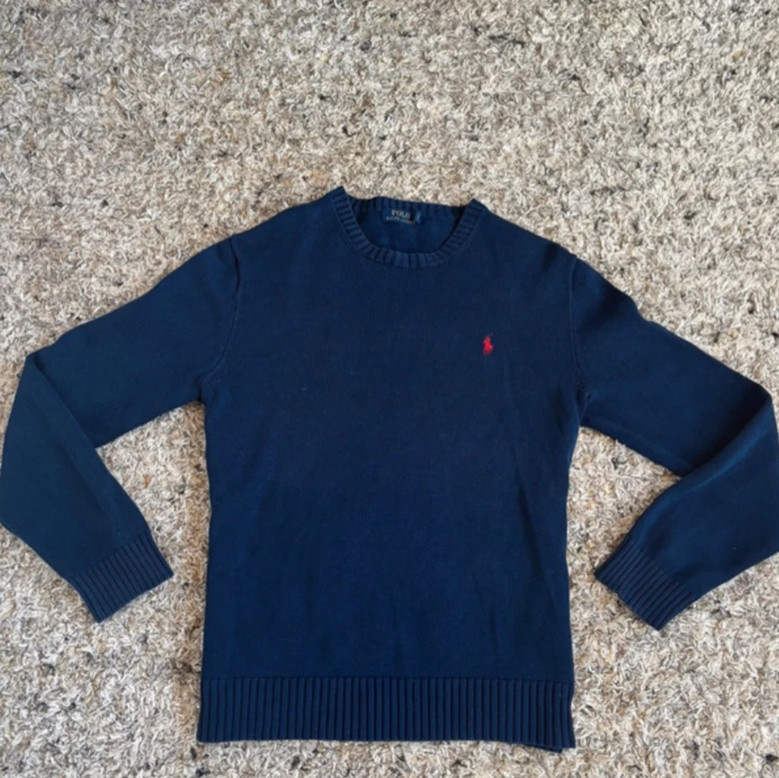 Säljer en marinblå stickad tröja från Polo Ralph Lauren i bomull. Klassisk rund halsringning, ribbade muddar och nederkant samt den ikoniska röda loggan broderad på bröstet. Perfekt för dig som gillar stilren och tidlös design.