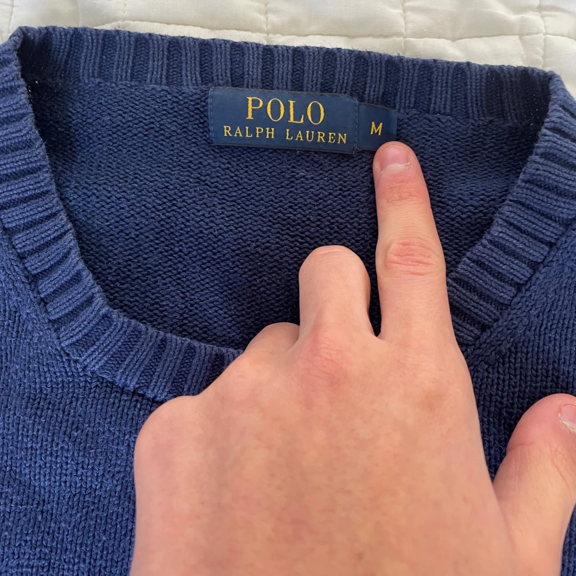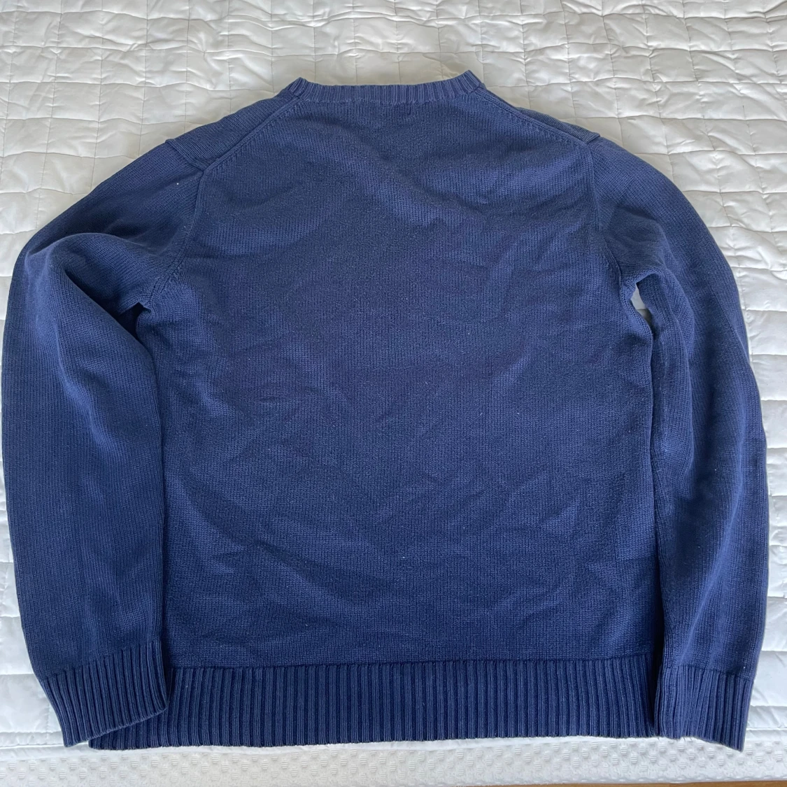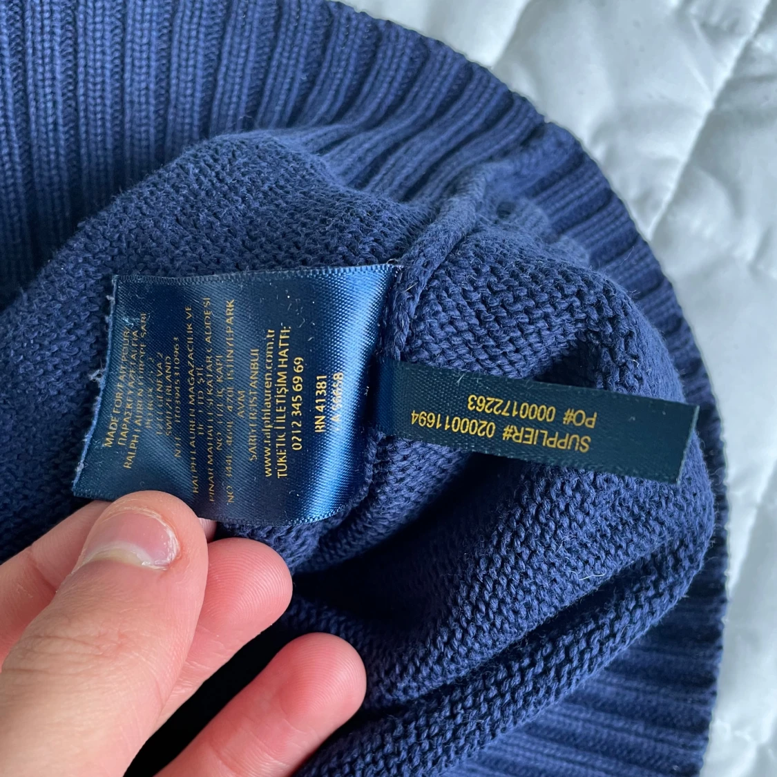 Säljer en marinblå stickad tröja från Polo Ralph Lauren i bomull. Klassisk rund halsringning, ribbade muddar och nederkant samt den ikoniska röda loggan broderad på bröstet. Perfekt för dig som gillar stilren och tidlös design.