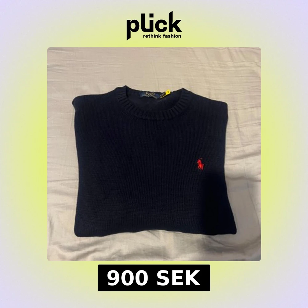 Snygg mörkblå stickad tröja från Polo Ralph Lauren i storlek M. Klassisk rund hals och långärmad modell med den ikoniska röda Polo-loggan broderad på bröstet. Perfekt för dig som gillar stilrena och tidlösa plagg med premiumkänsla.