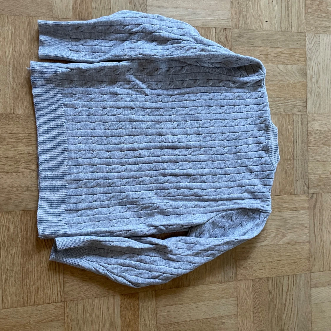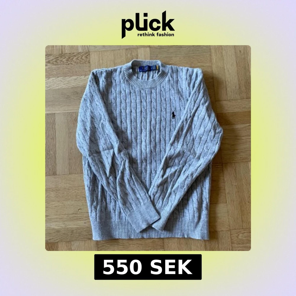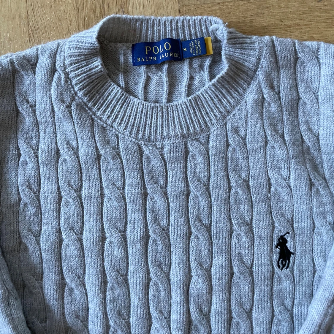 Säljer en grå kabelstickad tröja från Polo Ralph Lauren i storlek M. Tröjan har rund hals, lång ärm och klassisk broderad logga på bröstet. Tillverkad i mjuk bomull, perfekt för dig som gillar stilrena och tidlösa plagg.