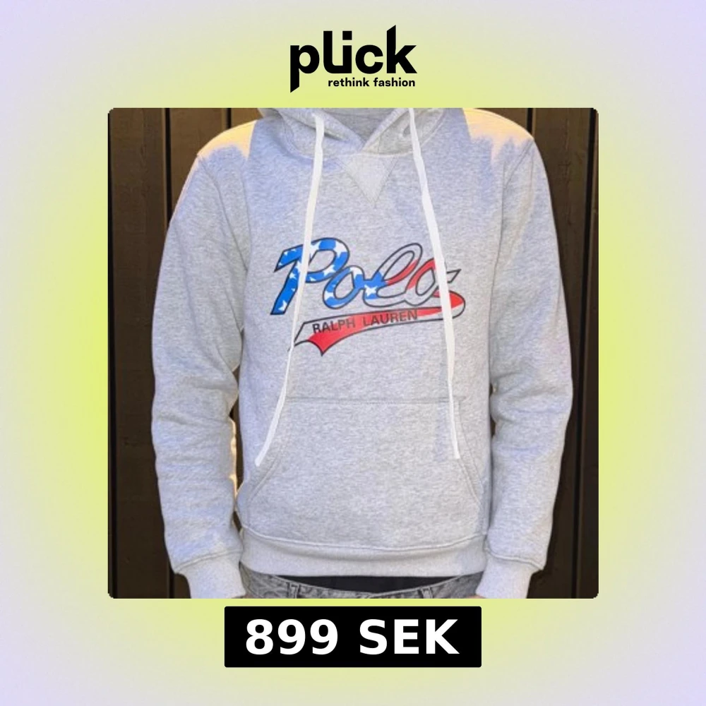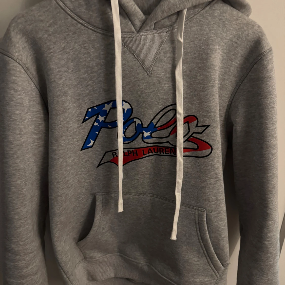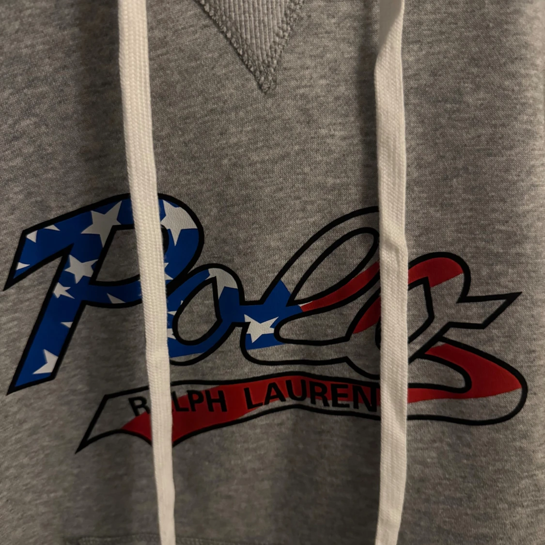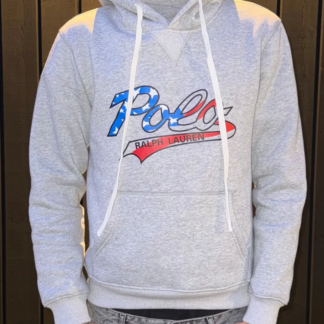 Snygg grå hoodie från Polo Ralph Lauren med stor logga framtill i blått, vitt och rött med stjärnmönster. Tröjan har huva med vita snören och en klassisk känguruficka. Perfekt för en chill och sportig look.