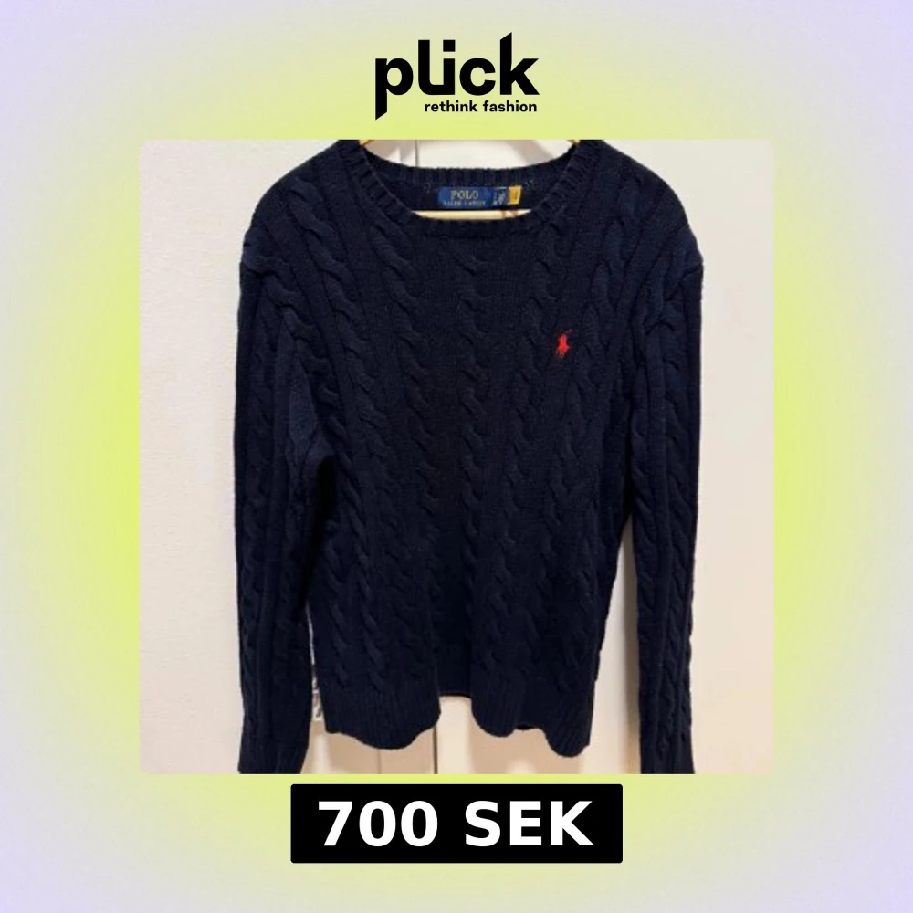 Säljer en klassisk mörkblå kabelstickad tröja från Polo Ralph Lauren med rund halsringning och röd broderad logga på bröstet. Jag säljer för att jag knappt använder längre. Hör av er vid frågor