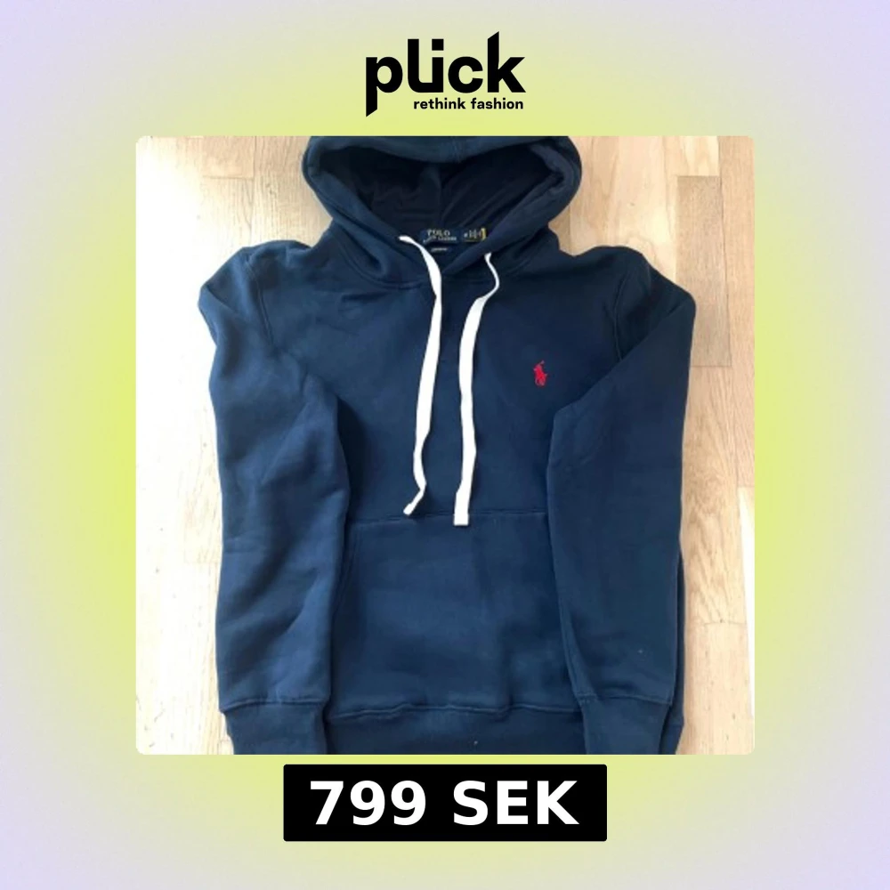 Säljer en marinblå hoodie från Polo Ralph Lauren med vit snörning och klassisk röd logga på bröstet. Tröjan har huva, känguruficka och är tillverkad i mjuk bomull. Perfekt för dig som gillar stilren och bekväm streetwear.