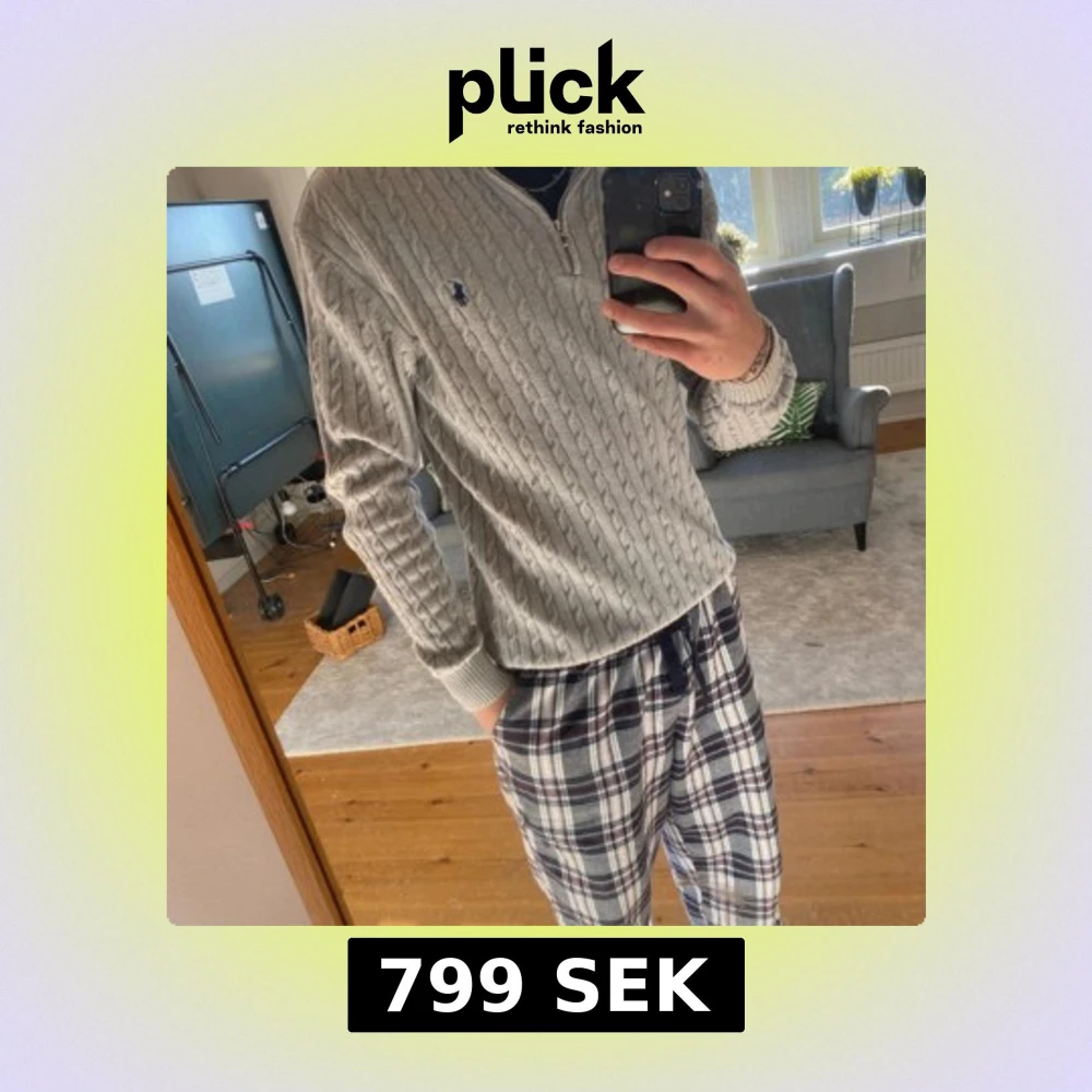 Säljer en grå kabelstickad tröja från Polo Ralph Lauren med halv dragkedja och broderad blå logga på bröstet. Tröjan har ribbade muddar, hög krage och är långärmad. Perfekt för lager-på-lager under höst och vinter.