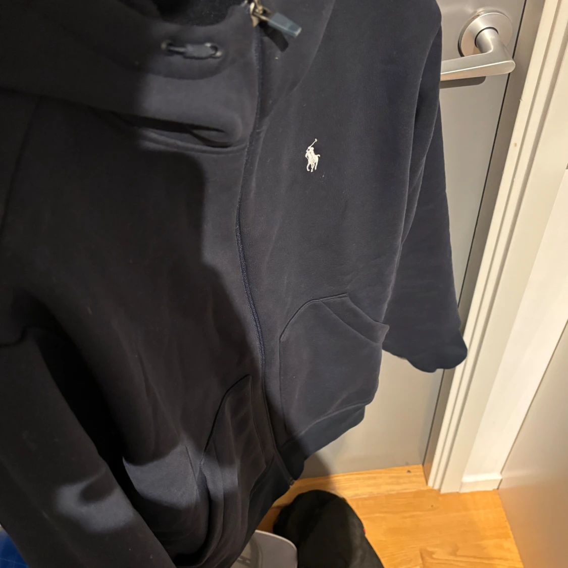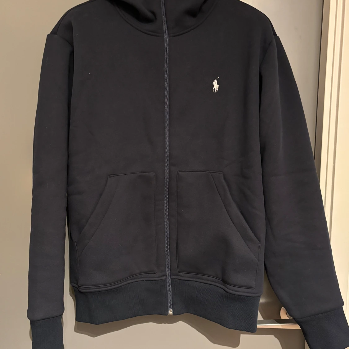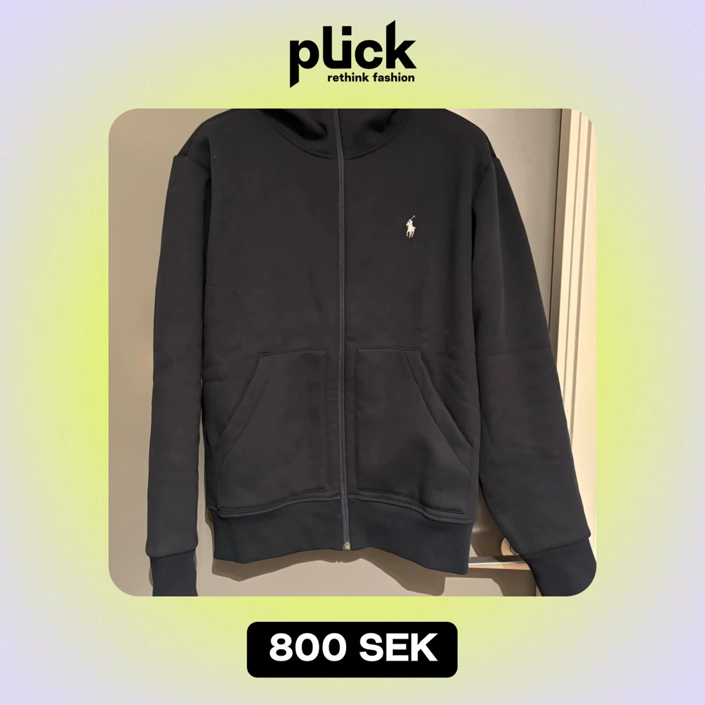 Snygg svart hoodie från Ralph Lauren med dragkedja och klassisk logga på bröstet. Perfekt för en avslappnad stil med praktiska fickor framtill. Passar bra till både jeans och träningsbyxor. Skick är helt ny då den tyvärr satt för stort på mig.