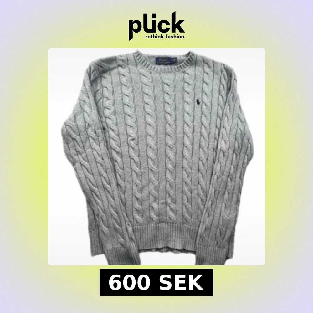 Säljer en stilren grå stickad tröja från Ralph Lauren med klassiskt flätmönster. Tröjan har en broderad logotyp på bröstet och ribbstickade muddar vid ärmslut och nederkant. Perfekt för kyliga dagar!