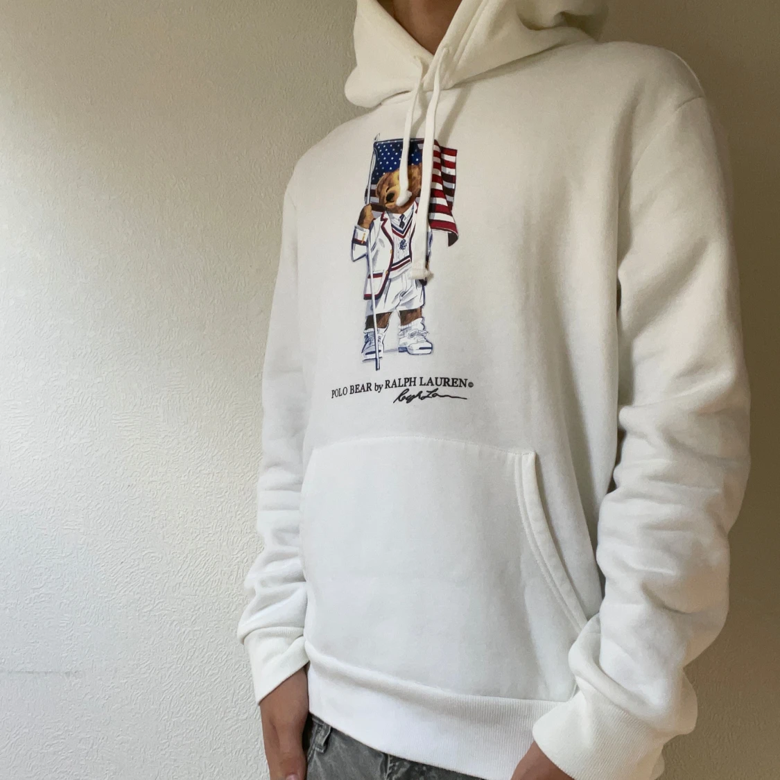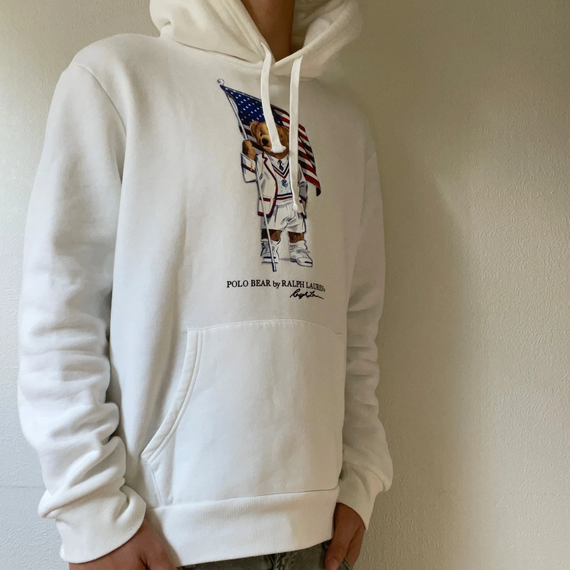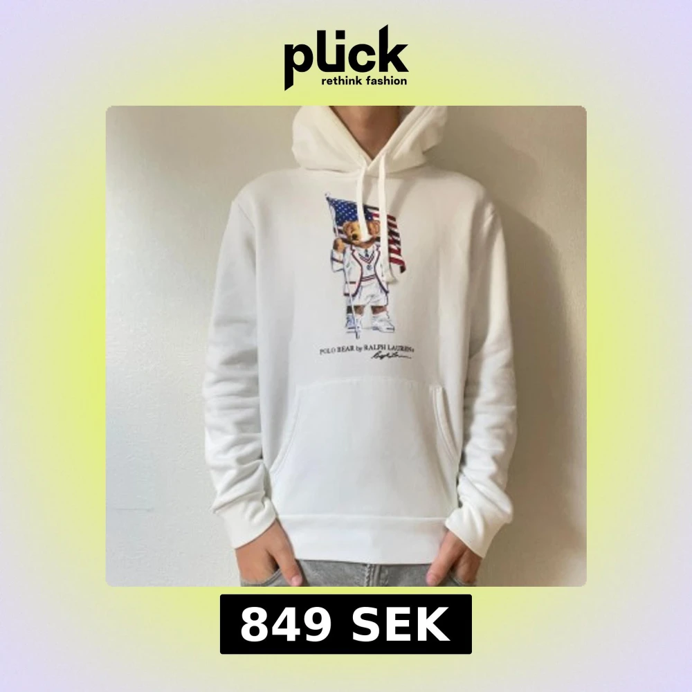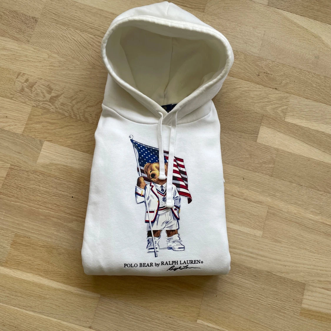 Vit hoodie från Ralph Lauren med Polo Bear-tryck på bröstet där björnen håller en amerikansk flagga. Klassisk känguruficka, dragsko i huvan och mjukt material. Perfekt för dig som gillar streetwear och vill sticka ut med en ikonisk look. Modellen på bilden är 176 cm!