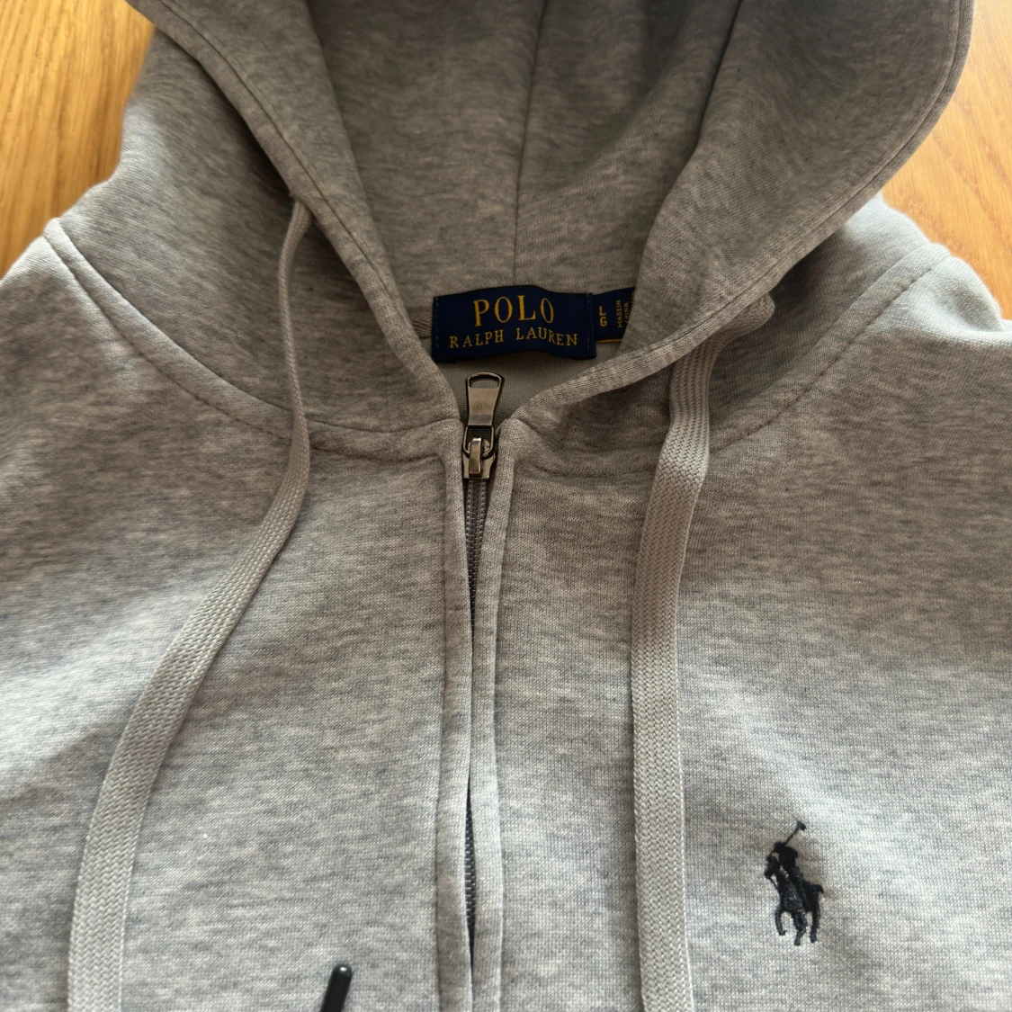 Snygg grå hoodie från Polo Ralph Lauren med dragkedja och huva. Klassisk logga broderad på bröstet, två fickor fram och ribbade muddar. Perfekt för chill dagar och enkel att matcha med jeans eller joggers.