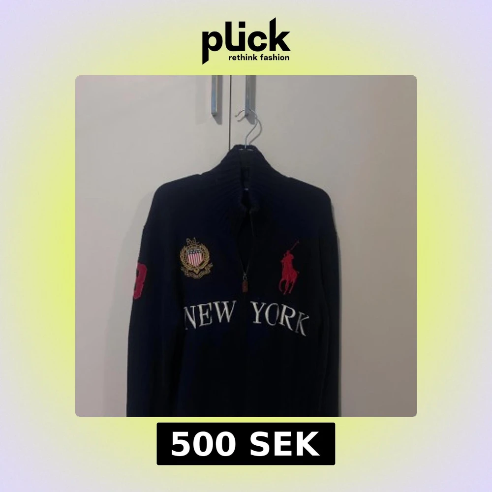 Snygg mörkblå stickad kofta från Polo Ralph Lauren med broderad New York-text och emblem på bröstet, samt röd logga och siffra på ärmen. Koftan har ribbad krage och dragkedja framtill. Perfekt för dig som gillar klassisk college-stil.