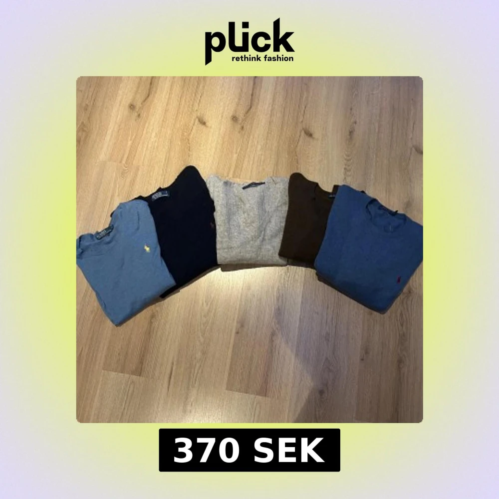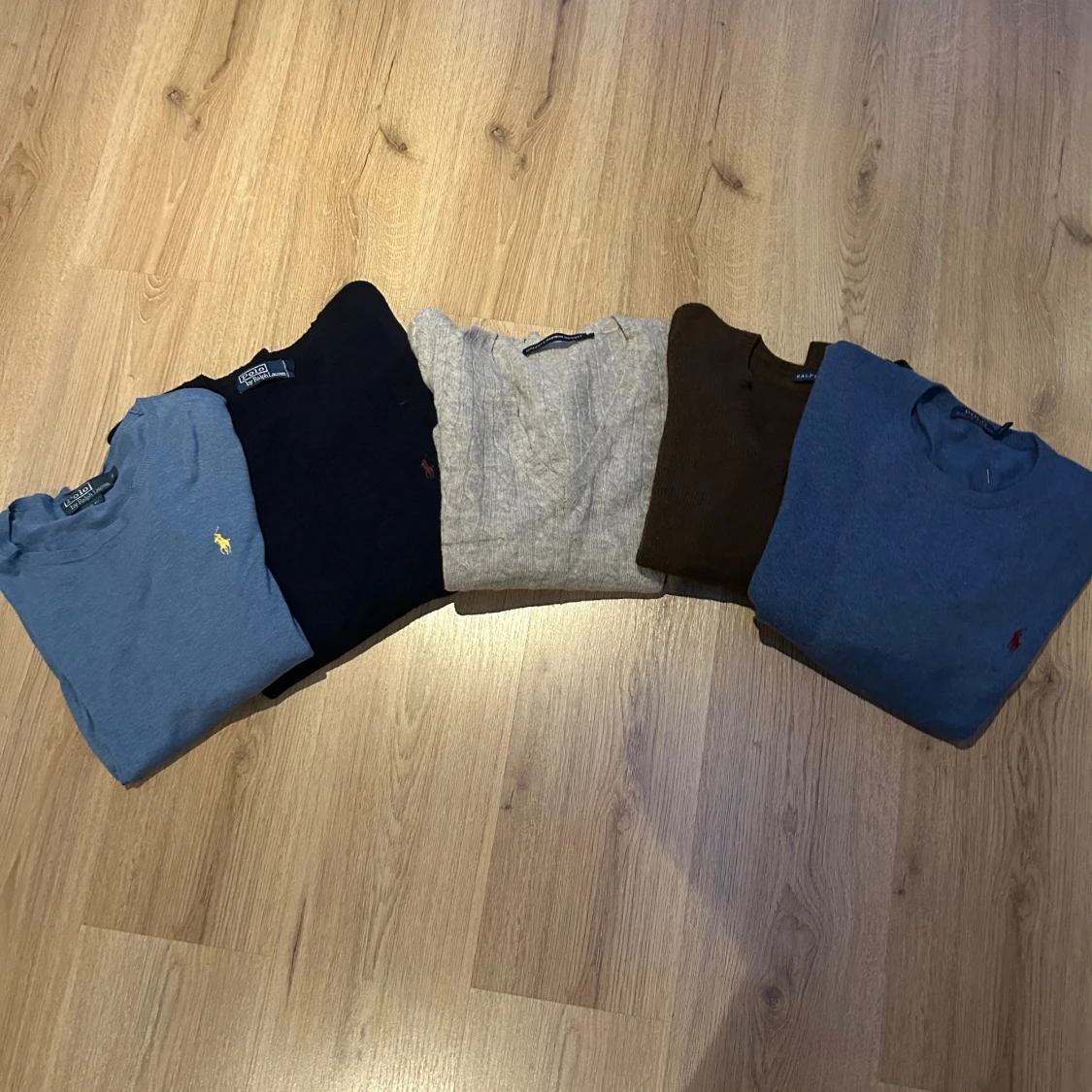Fem stickade tröjor från Ralph Lauren i blått, marinblått, beige, brunt och ljusblått. Klassisk rund halsringning och broderad logga på bröstet. Perfekta för lager-på-lager och snygga till jeans eller chinos.