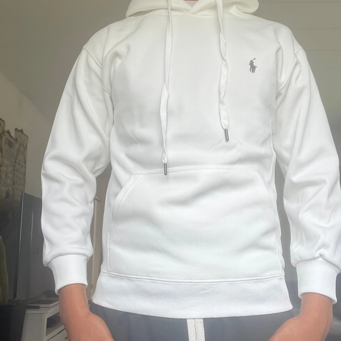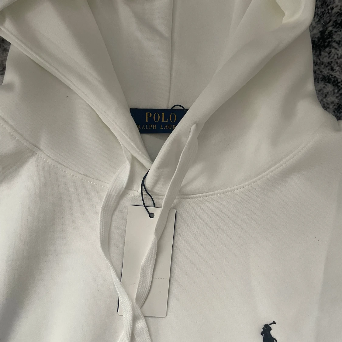 Snygg vit hoodie från Polo Ralph Lauren med klassisk logga broderad på bröstet. Tröjan har huva med snörning, känguruficka och ribbade muddar. Perfekt för en clean och stilren look. Tillverkad i mjuk bomull för extra komfort.