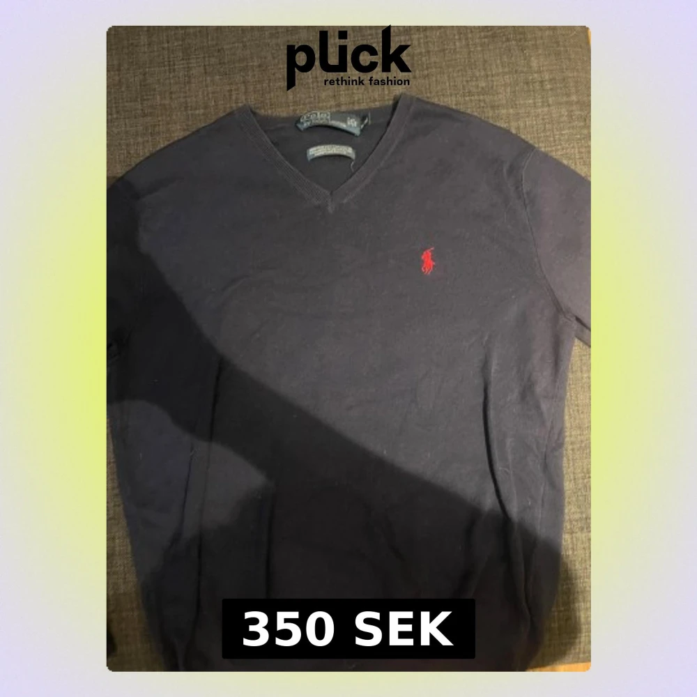 Mörkblå v-ringad tröja från Polo Ralph Lauren i 100% pima bomull. röd logga på bröstet och ribbade muddar vid hals, ärmslut och nederkant. Säljer då jag växt ur den. Vid eventuella frågor hör av er. MVH Måns