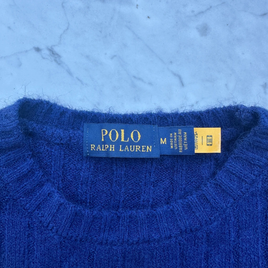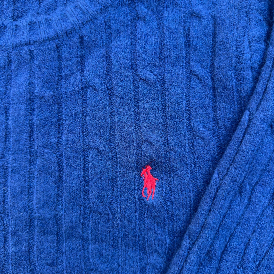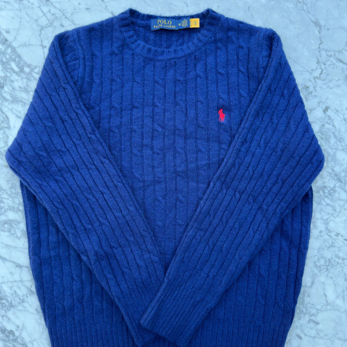 Säljer en mysig blå stickad tröja från Polo Ralph Lauren med klassiskt kabelstickat mönster och röd broderad logga på bröstet i storlek M. Jag köpte den nyskriven av en annan person men säljer den vidare då den tyvärr inte passade mig. Tröjan är i nyskick.