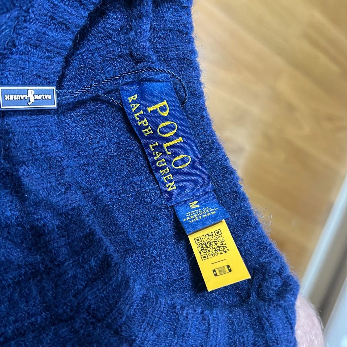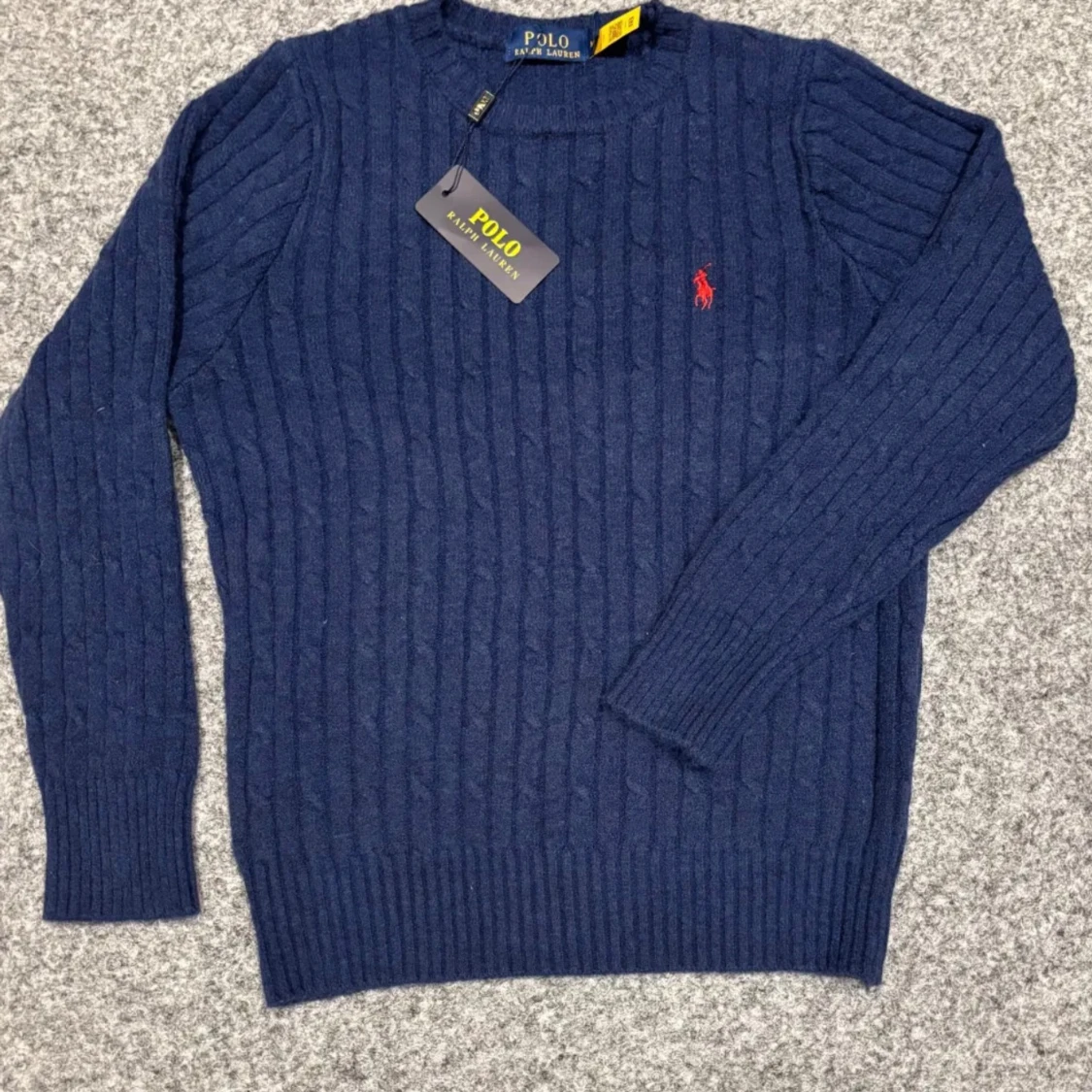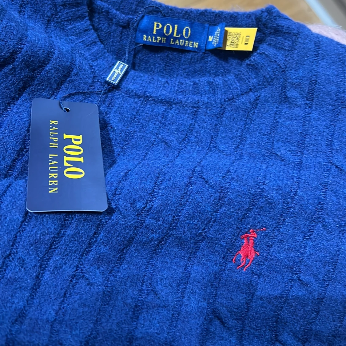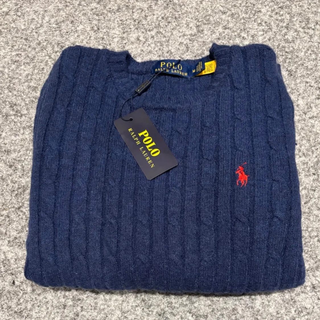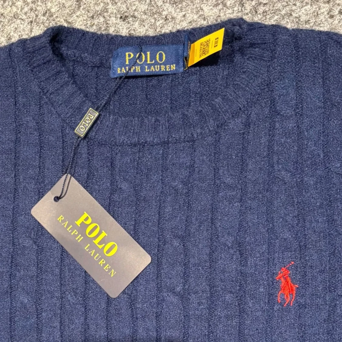 Helt ny Kabelstickad blå tröja från Polo Ralph Lauren med klassisk rund hals och röd broderad logga på bröstet. Tröjan har Ettiketen kvar. PRISER KAN DISKUTERAS!!