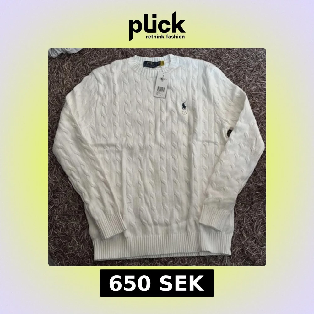 Vit kabelstickad tröja från Polo Ralph Lauren med klassisk rund halsringning och broderad marinblå logga på bröstet. Tröjan har ribbade muddar och är tillverkad i mjuk bomull. Perfekt för en clean och stilren look.