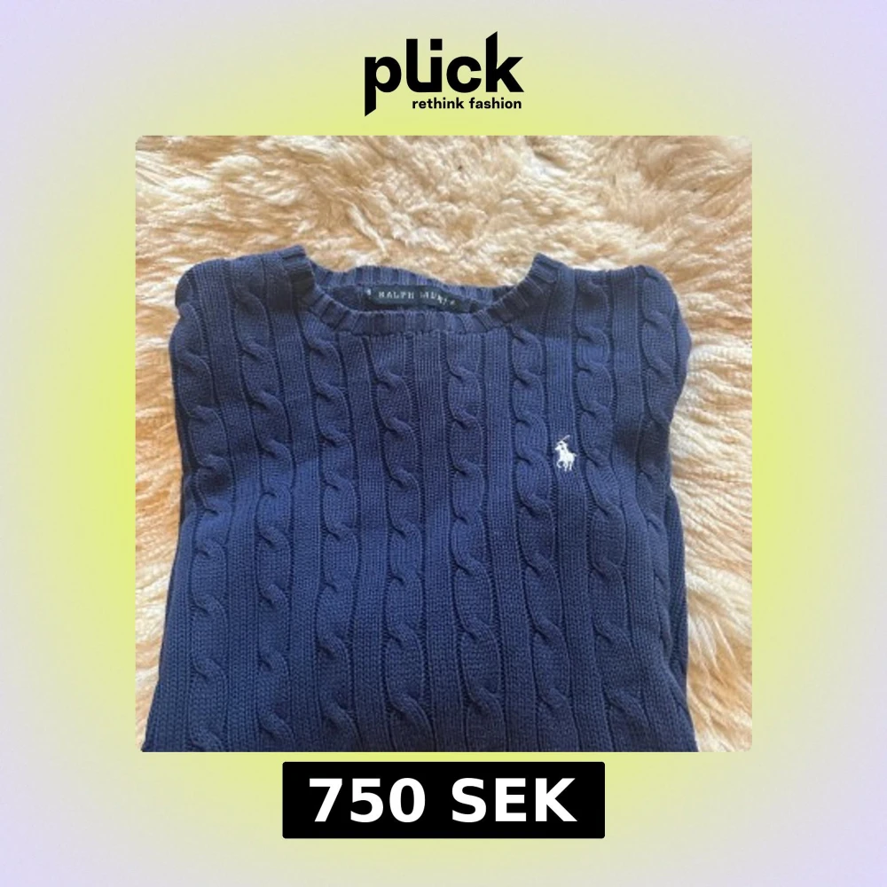 Säljer en snygg mörkblå stickad tröja från Ralph Lauren med kabelstickat mönster. Tröjan har långa ärmar och en klassisk rund halsringning. Perfekt för kyligare dagar!