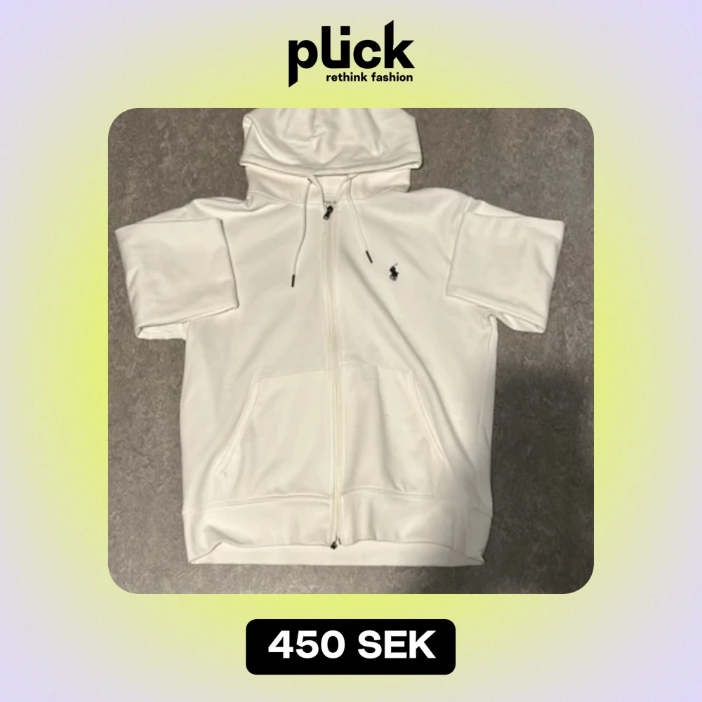En vit hoodie från Ralph Lauren med dragkedja framtill och korta ärmar. Hoodien har en broderad logotyp på bröstet och en justerbar huva med dragsko. Två fickor framtill.