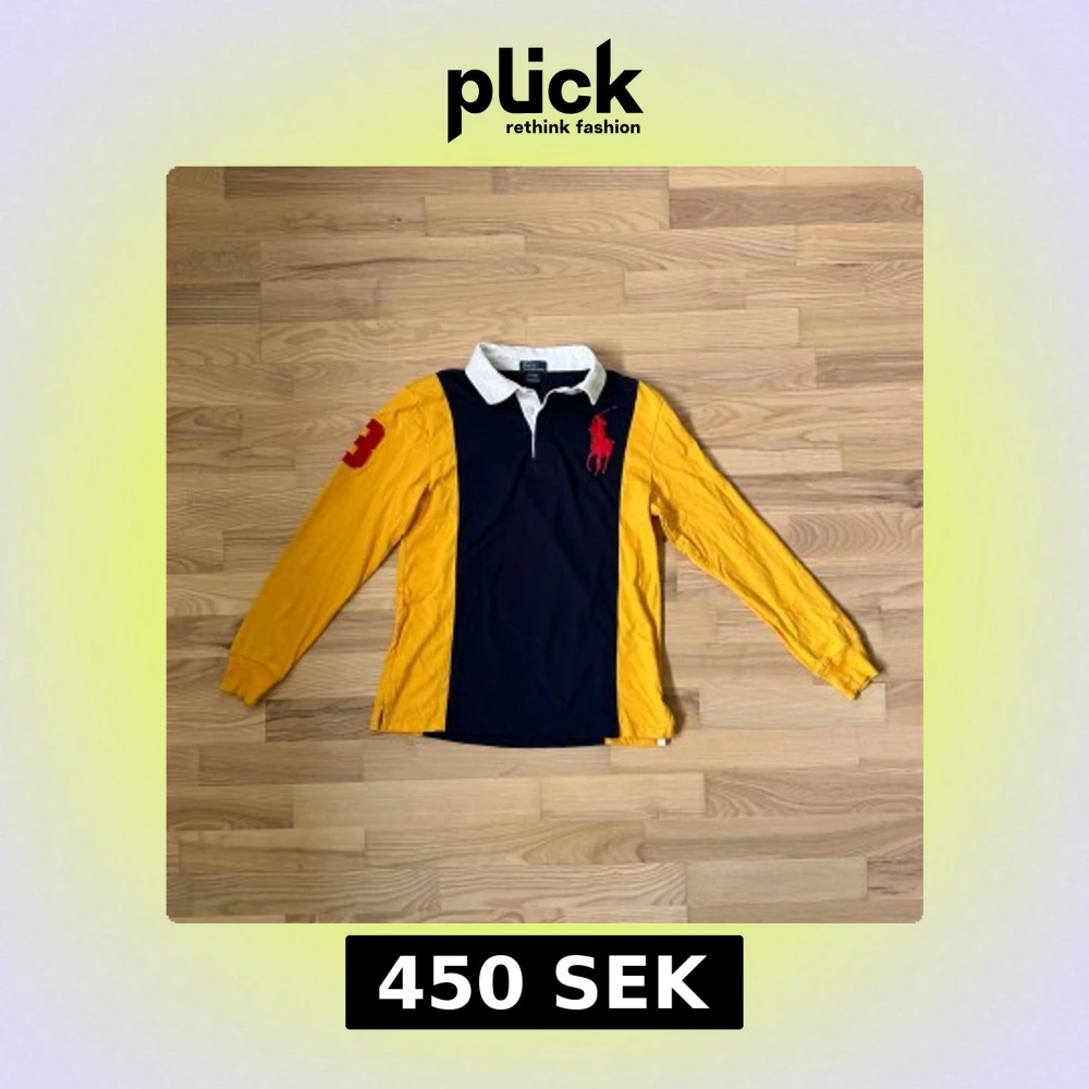 Säljer en långärmad pikétröja från Polo Ralph Lauren i gul och marinblå med vit krage. Stor röd Polo-logga på bröstet och en röd 3:a på ärmen. Tröjan är gjord i mjuk bomull och har en klassisk passform som är både chill och snygg. L i barnstorlek men runt XS-S i män storlek.