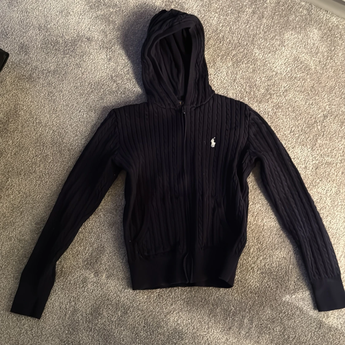 Säljer en snygg svart stickad hoodie från Ralph Lauren med dragkedja och det klassiska logotypbroderiet på bröstet. Tröjan har långa ärmar och en mysig huva, perfekt för kyliga dagar. Passar både till vardags och mer avslappnade tillfällen.