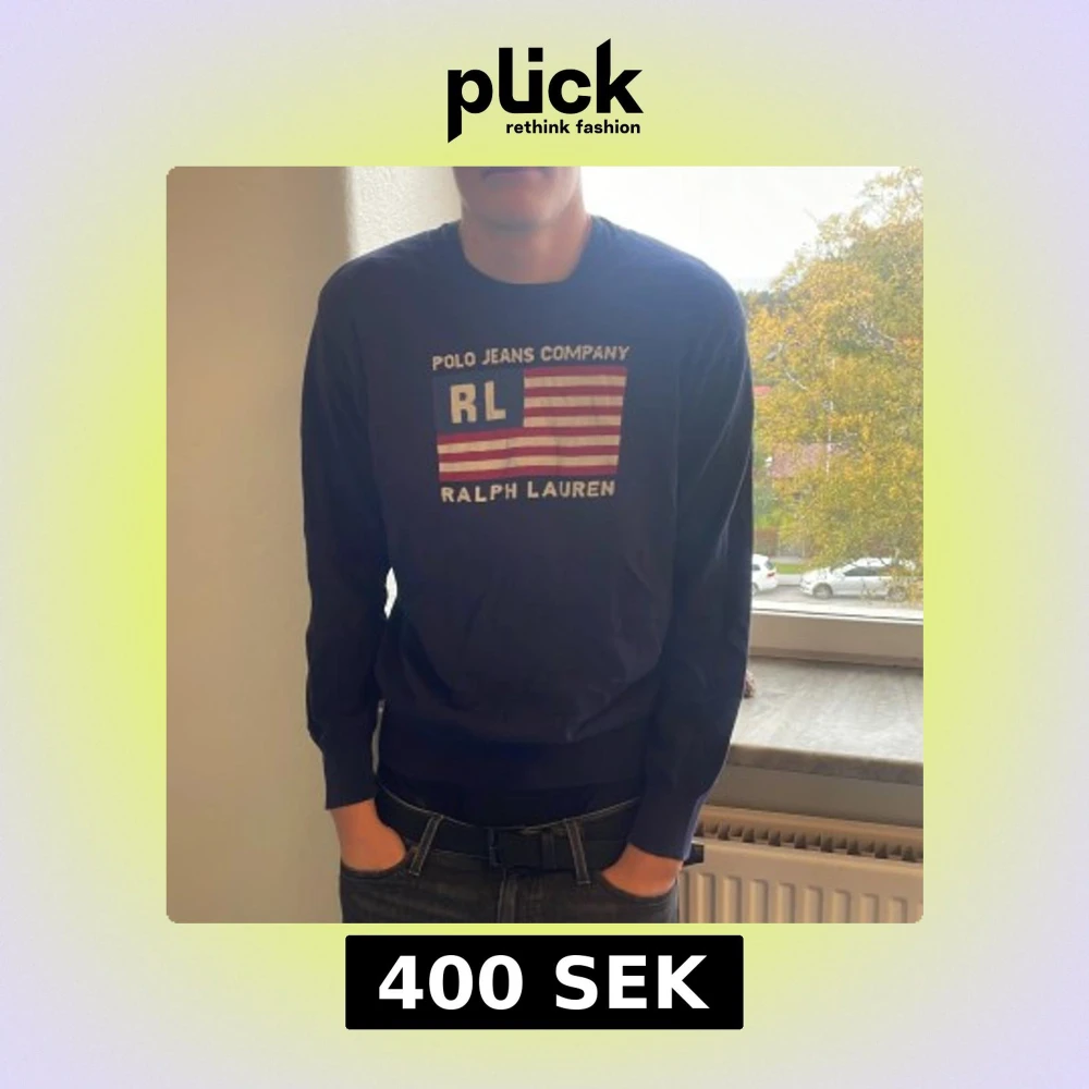 Säljer en mörkblå långärmad tröja från Ralph Lauren Polo Jeans Company med tryckt RL-logga och amerikansk flagga på bröstet. Tröjan har rund halsringning och ribbade muddar vid ärmslut och midja. Perfekt för dig som gillar klassisk streetstyle.