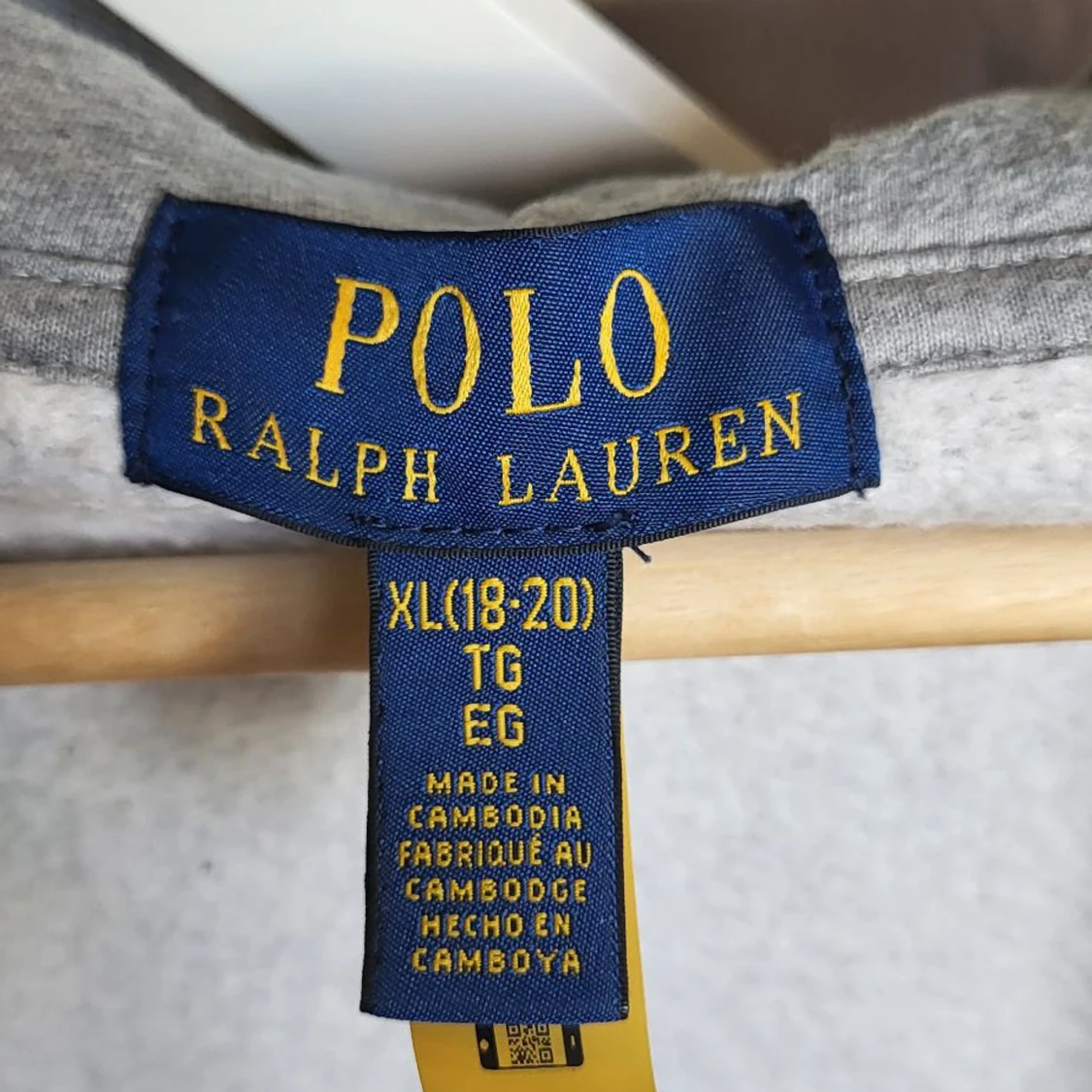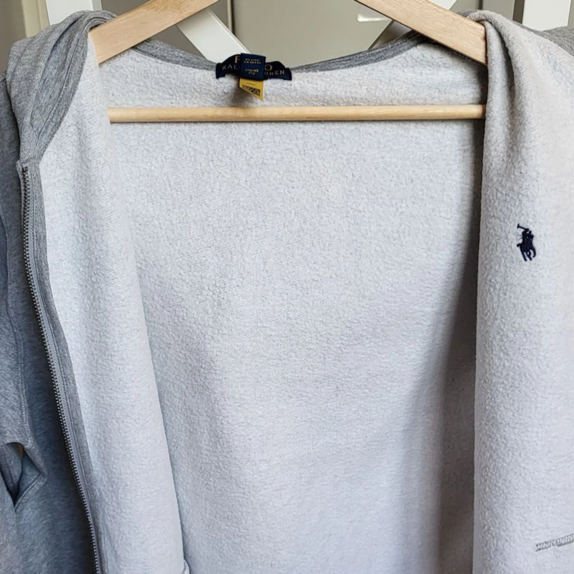 Klassisk grå zip hoodie från Polo Ralph Lauren i storlek ungdoms XL/170. Tröjan har dragkedja framtill, huva och kängurufickor. Liten mörkblå logga broderad på bröstet. Perfekt för chill dagar och enkel att matcha med jeans eller joggers.