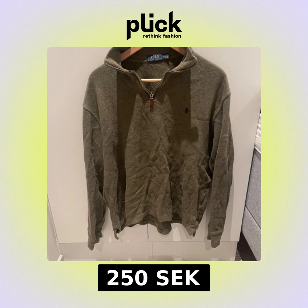 Säljer en olivgrön tröja från Ralph Lauren med dragkedja vid halsen och ett lila broderat märke på bröstet.