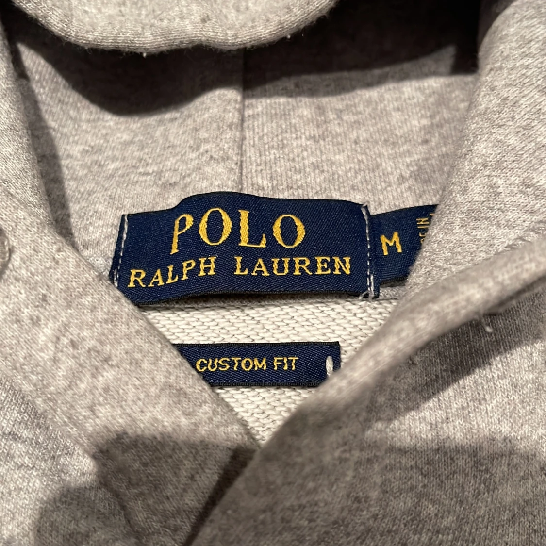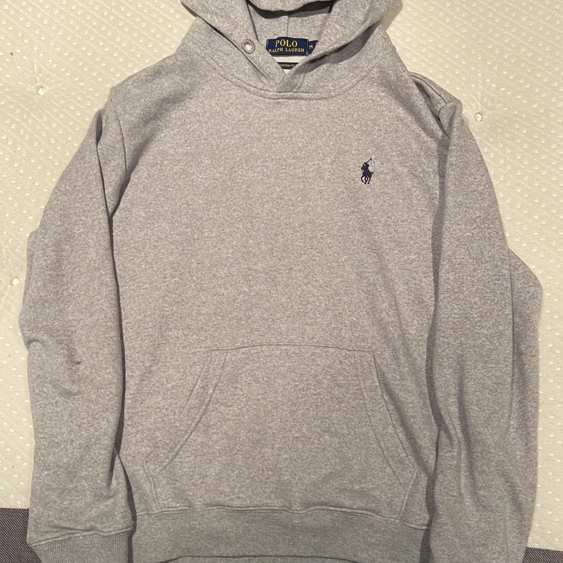 Säljer en stilren grå hoodie från Ralph Lauren med det klassiska broderade logotypen på bröstet. Tröjan har en känguruficka och ribbade muddar vid ärmslut och nederkant. Perfekt för en avslappnad look. Står medium men har krympt så är perfekt om du är en Small
