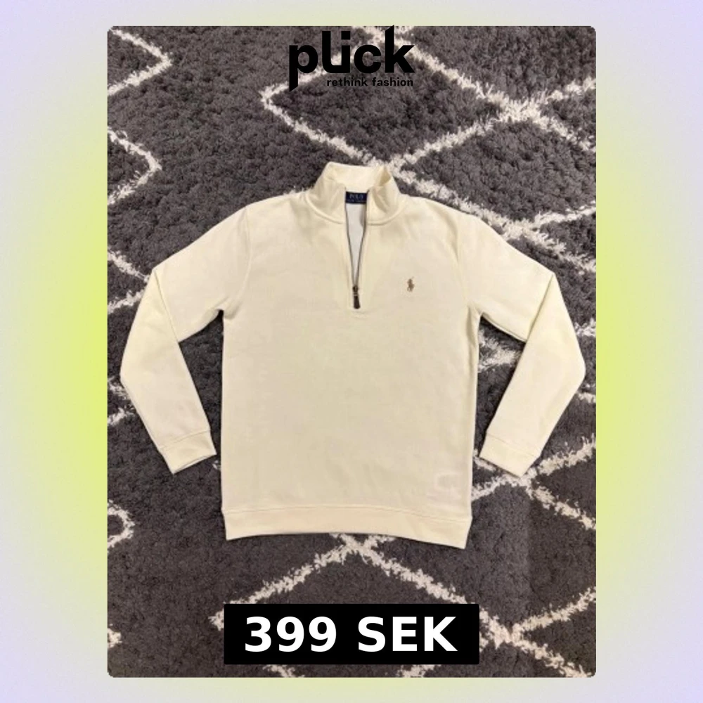 Snygg vit långärmad tröja från Polo Ralph Lauren med klassisk ståkrage och half zip-dragkedja framtill. Tröjan har det ikoniska Polo-logot broderat på bröstet och är gjord i mjuk bomull. Storlek S. Jag är 180cm och den passar mig perfekt.