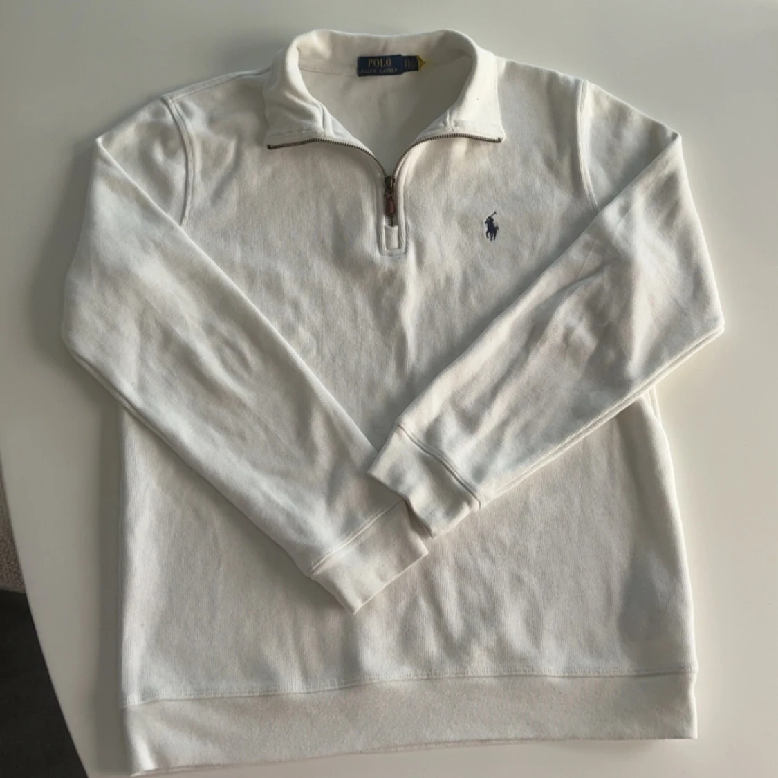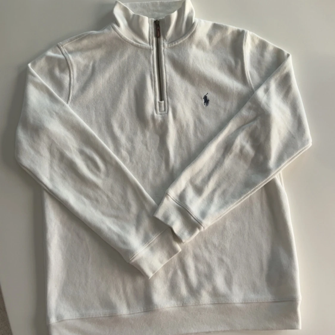 Stilren och klassisk vit half-zip tröja från Ralph Lauren. ✅ Äkta vara ✅ Storlek: S ✅ I princip oanvänd – i nyskick ✅ Nypris: 1100 kr 💸 Nu endast 450 kr! Perfekt både till vardags och för en mer uppklädd look. Säljer endast p.g.a. garderobsrensning. Passa på att fynda en kvalitetsklassiker till ett riktigt bra pris!