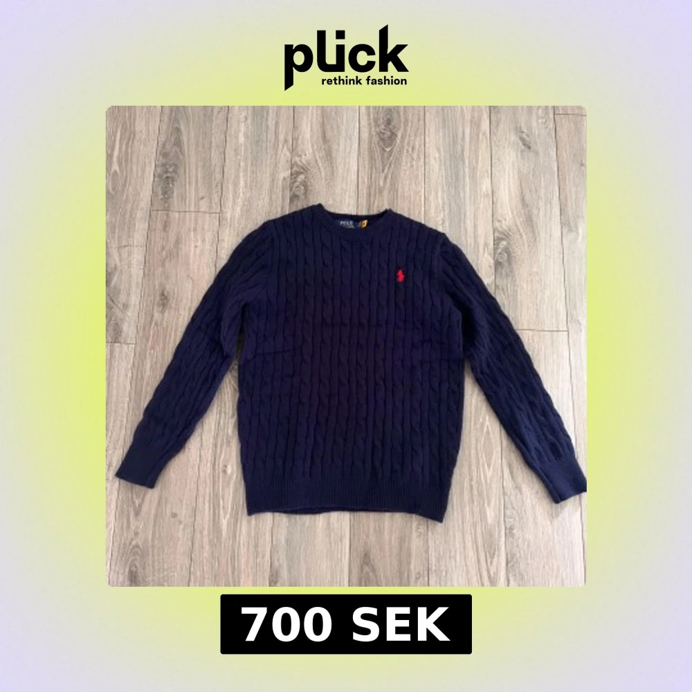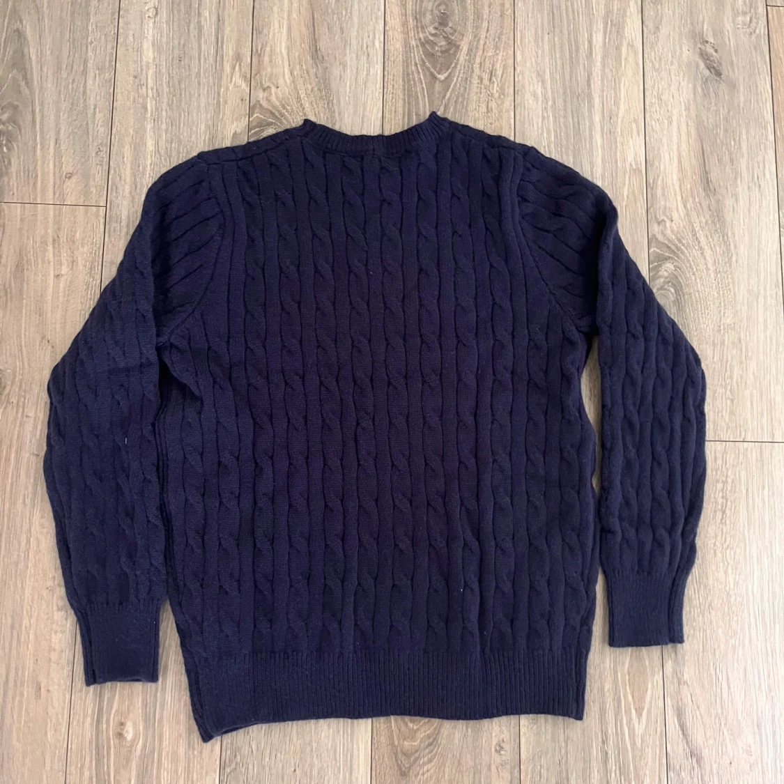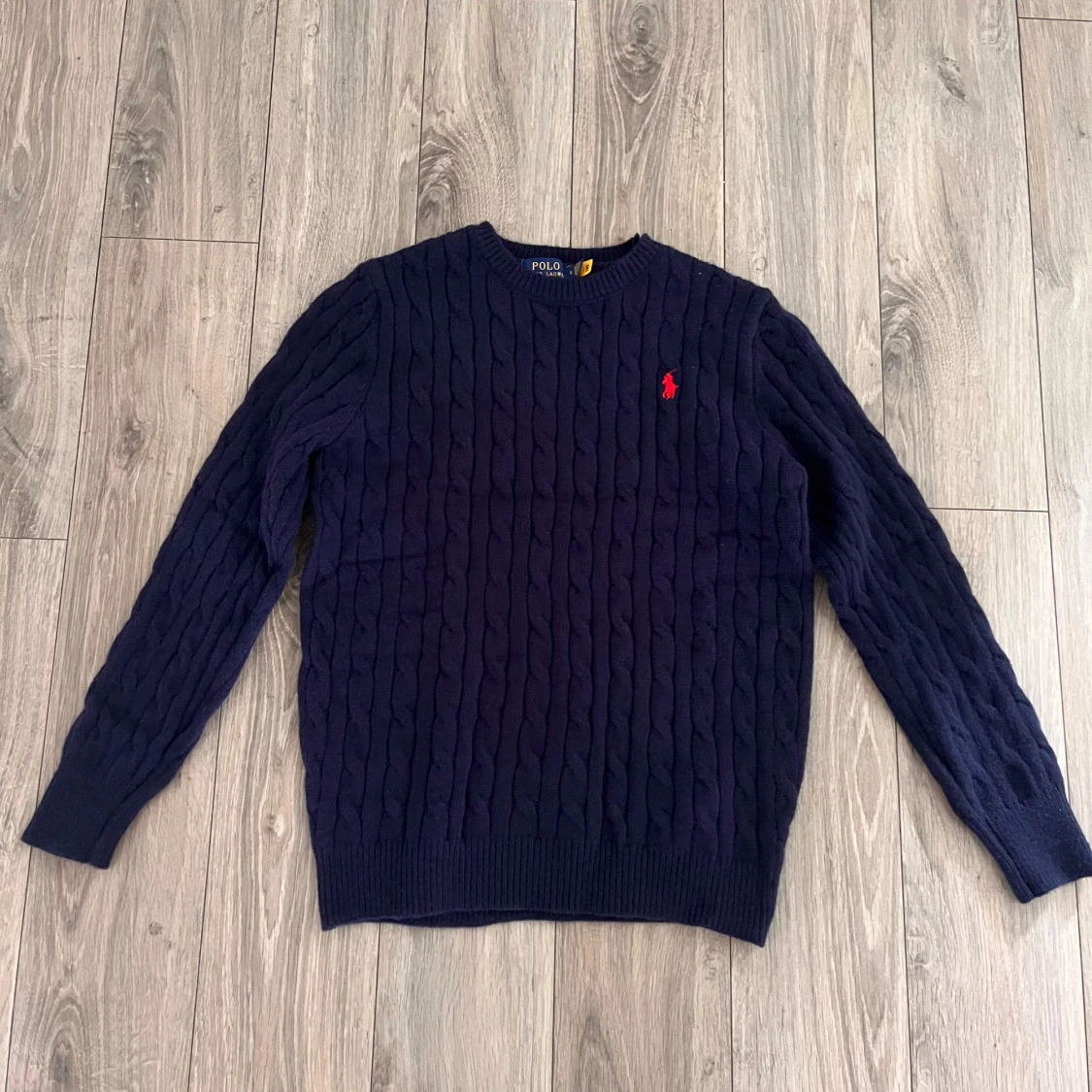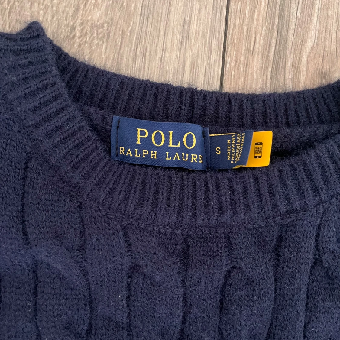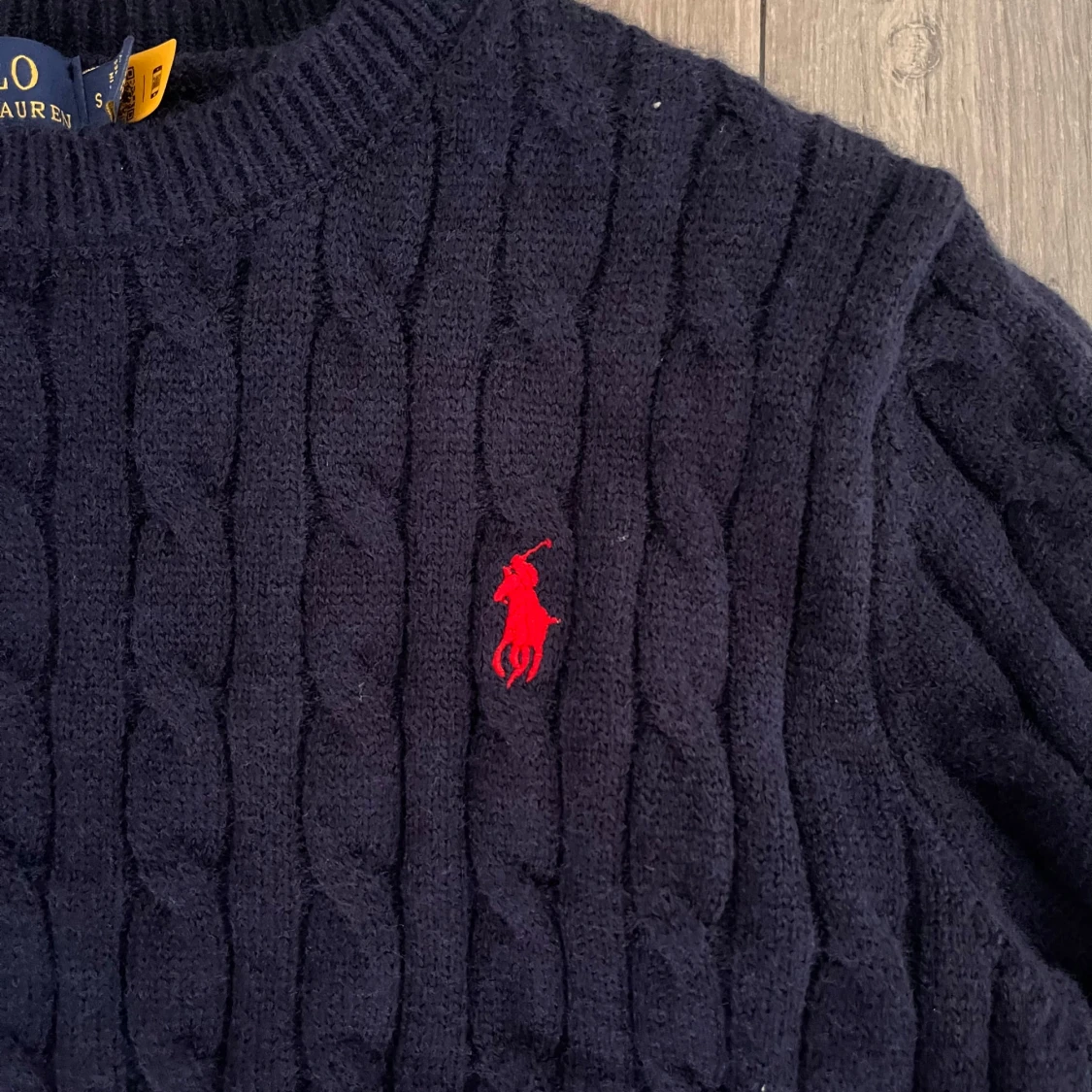Mörkblå kabelstickad tröja från Polo Ralph Lauren med klassisk röd logobrodyr på bröstet. Rund hals och ribbade muddar vid ärmslut och nederkant. Perfekt för dig som gillar stilren och tidlös design.
