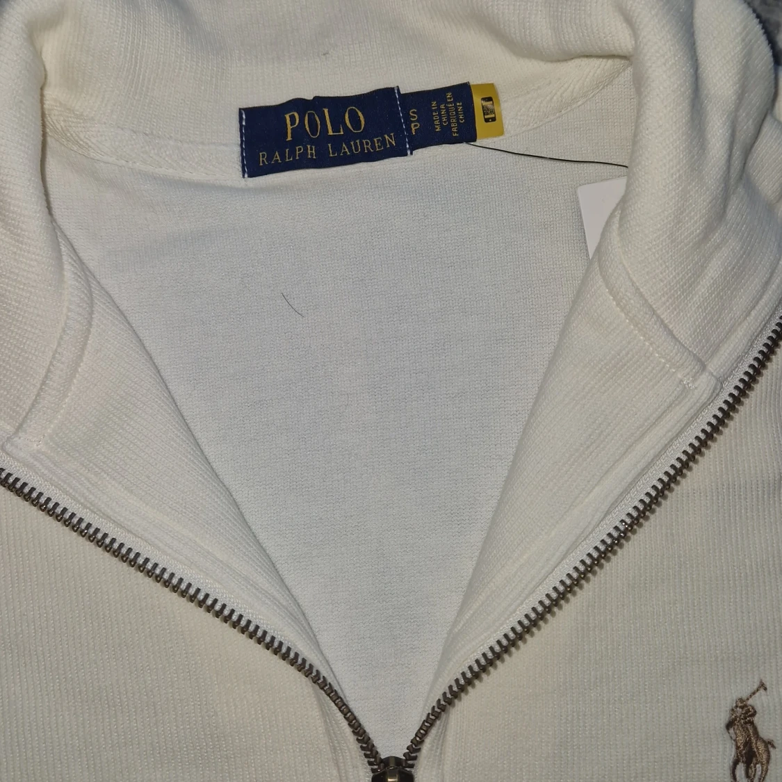 Vit långärmad tröja från Polo Ralph Lauren med klassisk broderad logga på bröstet. Tröjan har en hög krage och half zip-dragkedja framtill. Tillverkad i mjuk bomull och har en clean, stilren look som passar perfekt till jeans eller chinos.