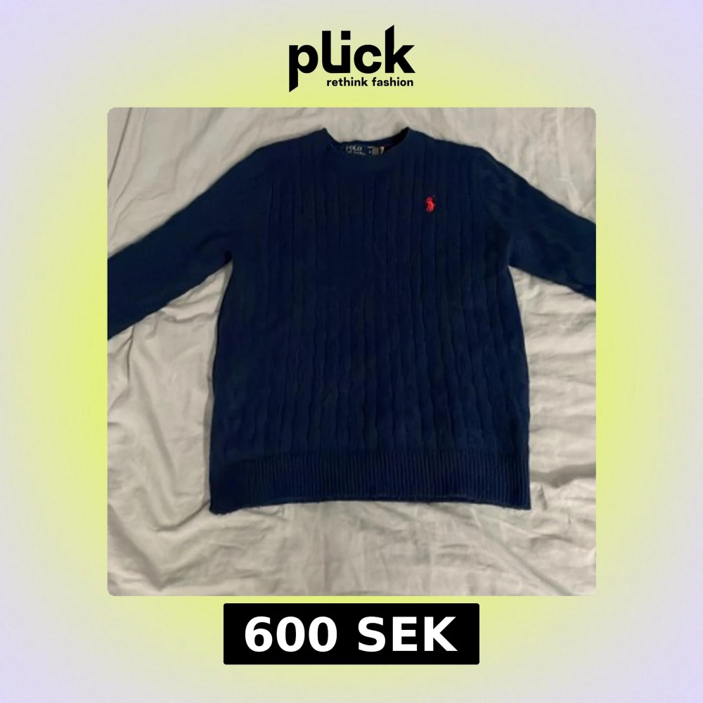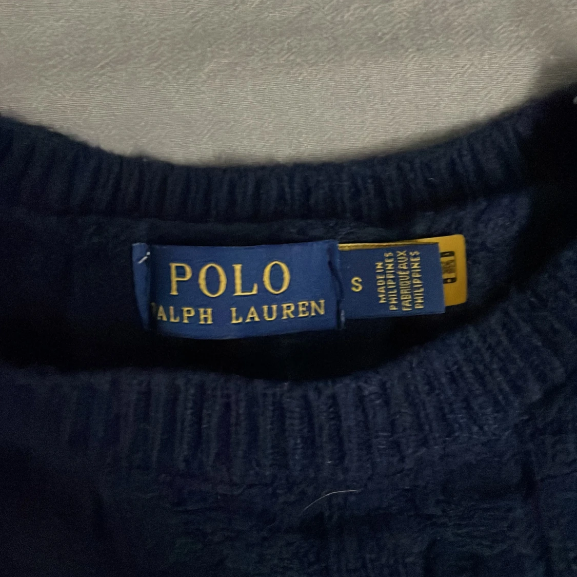 Kabelstickad marinblå tröja från Polo Ralph Lauren med klassisk rund hals och lång ärm. Tröjan har det ikoniska röda broderade logot på bröstet och ribbade muddar vid ärmslut och nederkant. Perfekt för en stilren och tidlös look.