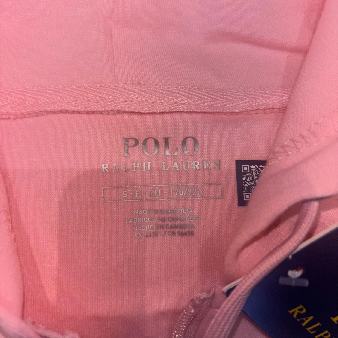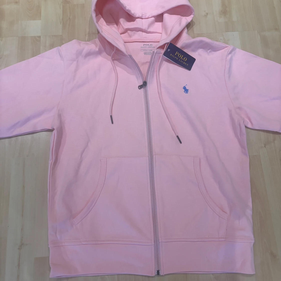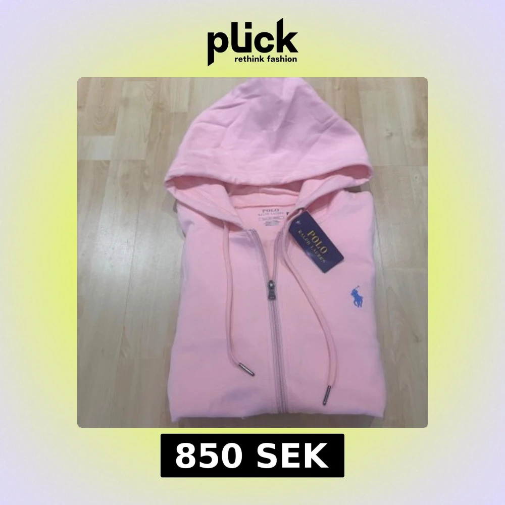 Säljer en ljusrosa hoodie från Polo Ralph Lauren med dragkedja och huva. Tröjan har snörning i huvan, två fickor framtill och en blå broderad logga på bröstet. Tillverkad i mjuk bomull, perfekt för chill dagar.