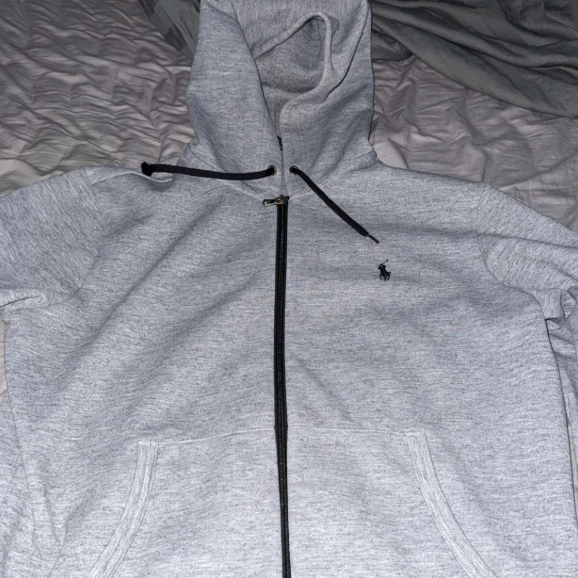 Snygg grå hoodie från Ralph Lauren med svart logga på bröstet. Tröjan har hel dragkedja, huva med svarta snören och två fickor framtill. Perfekt för chill dagar eller när du vill ha en clean streetstyle.