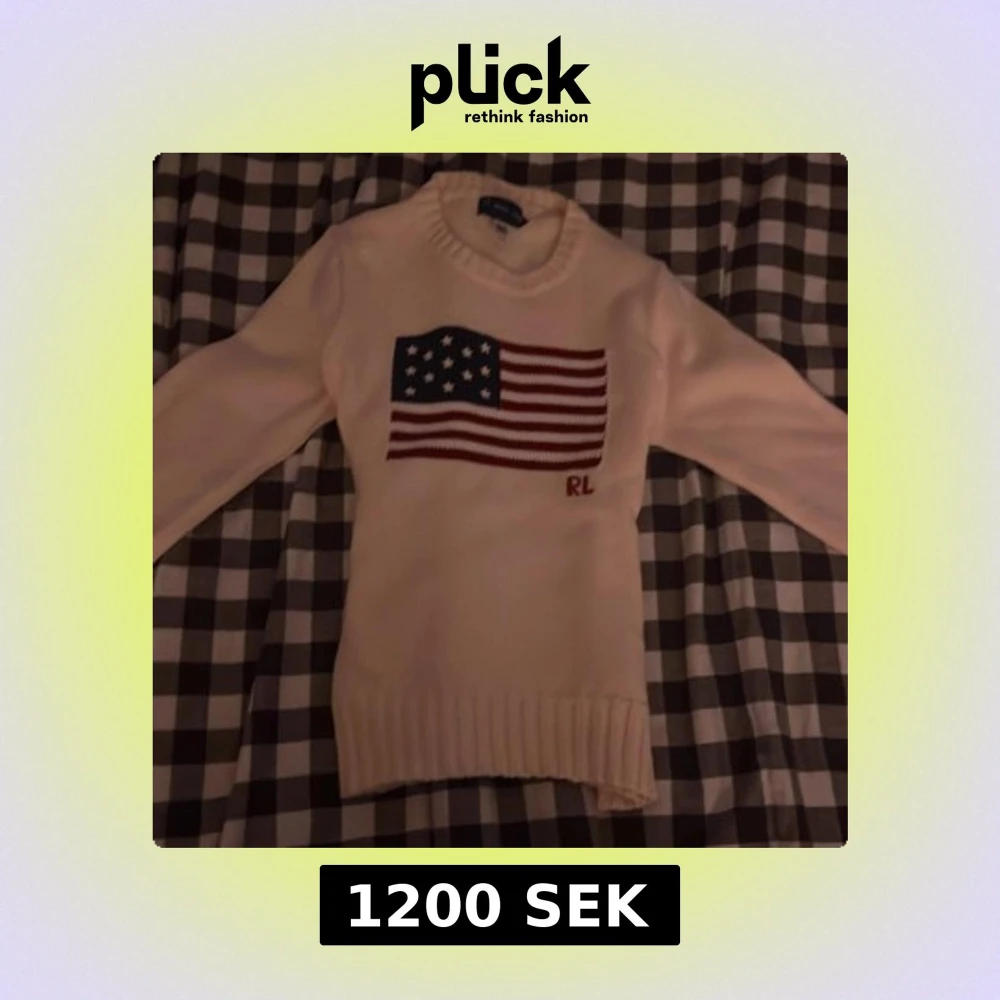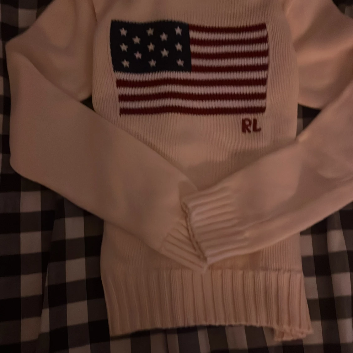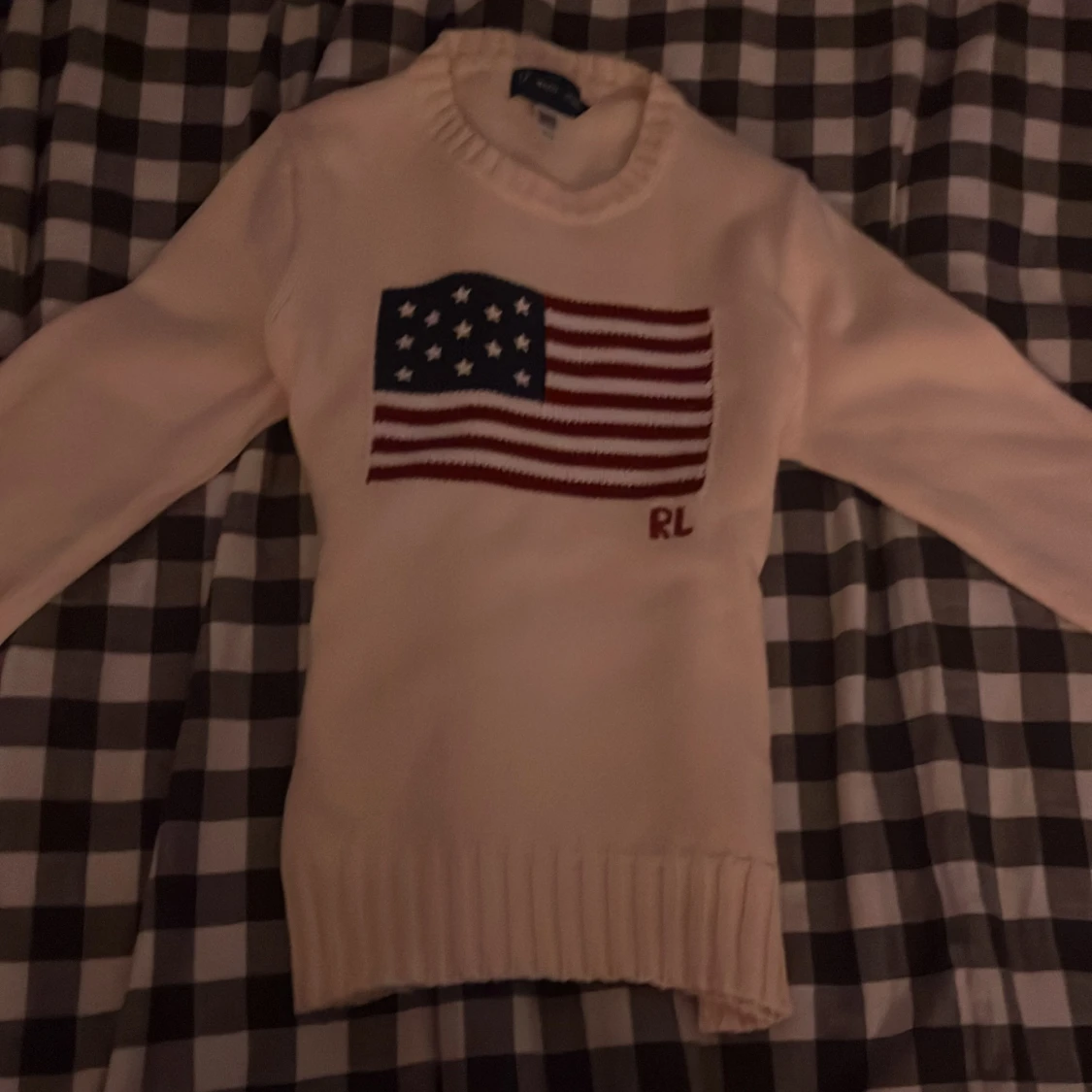 Vit stickad tröja från Ralph Lauren med amerikansk flagga broderad på bröstet. Köpte för 4000kr använt 2 gånger, skriv om ni har frågor eller vill ha mer bilder💕