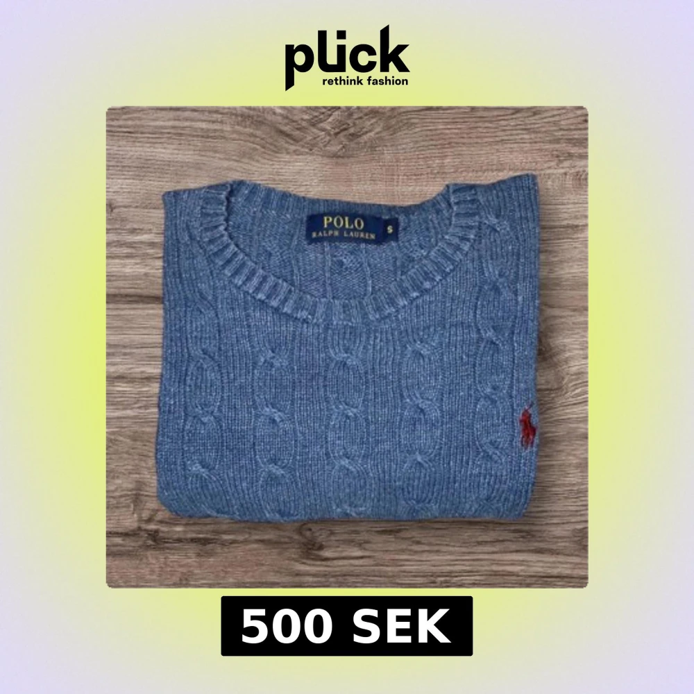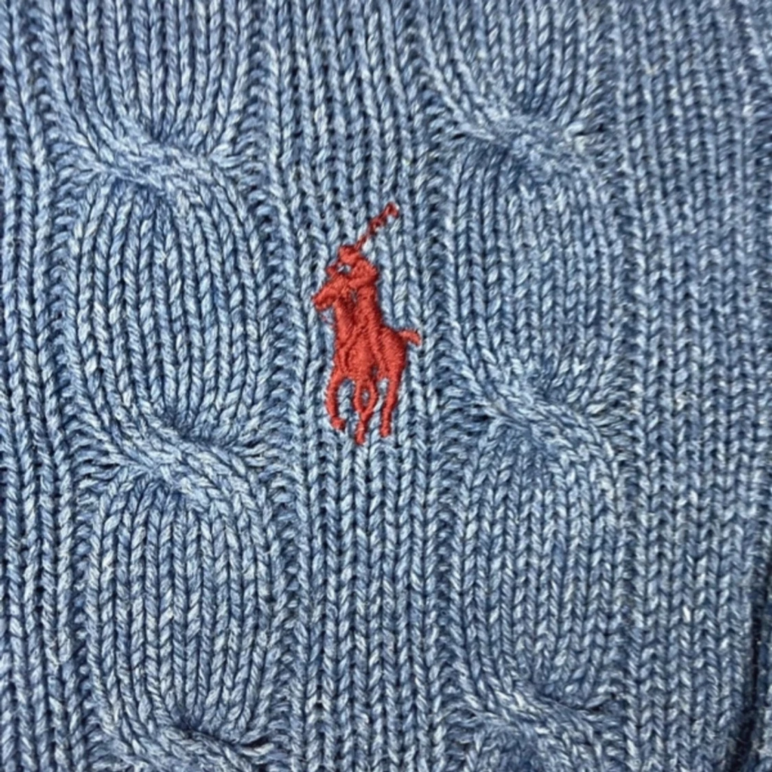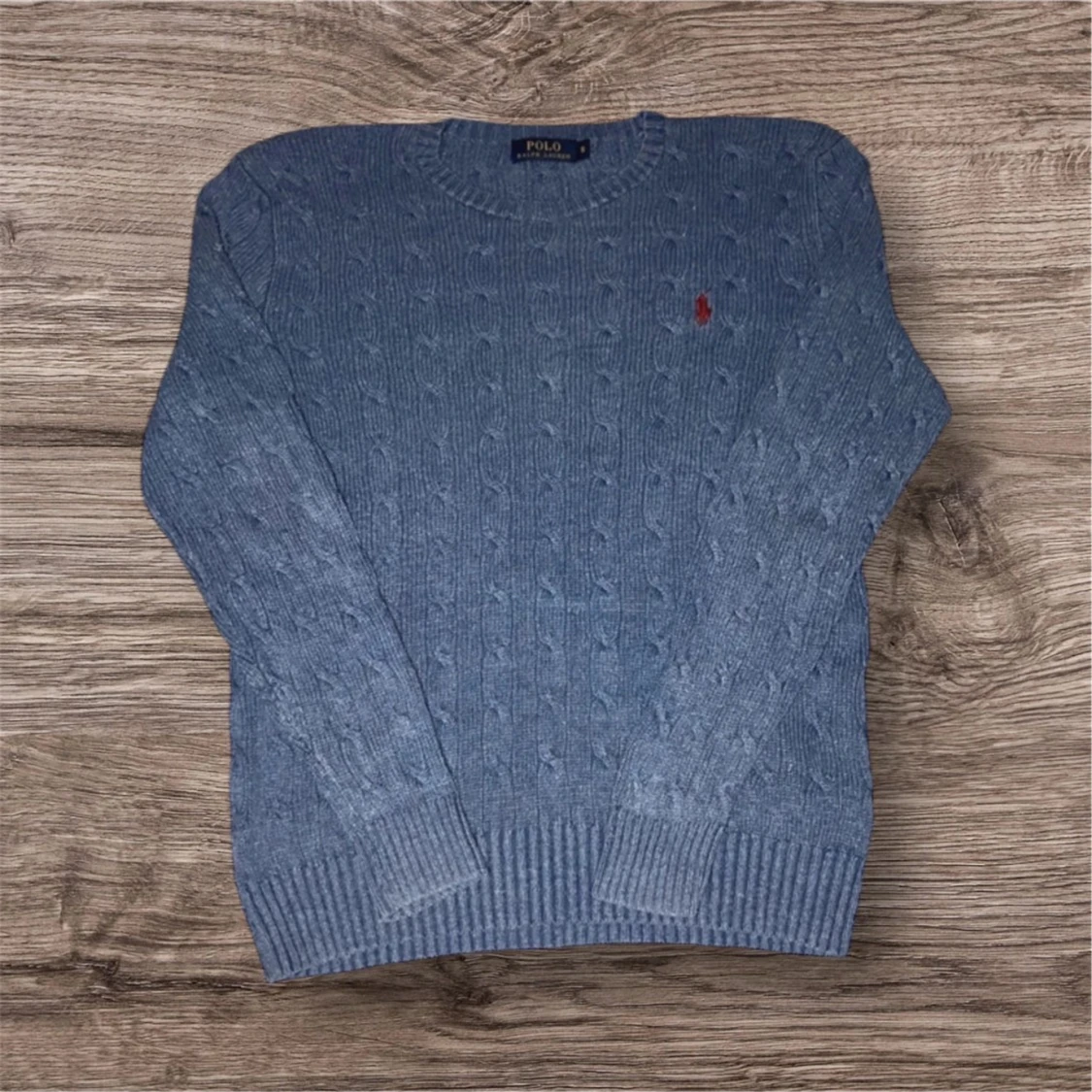 Säljer en klassisk blå stickad tröja från Polo Ralph Lauren med kabelstickat mönster och rund hals. Tröjan har långa ärmar och en liten röd broderad logga på bröstet. Perfekt för en stilren och tidlös look.